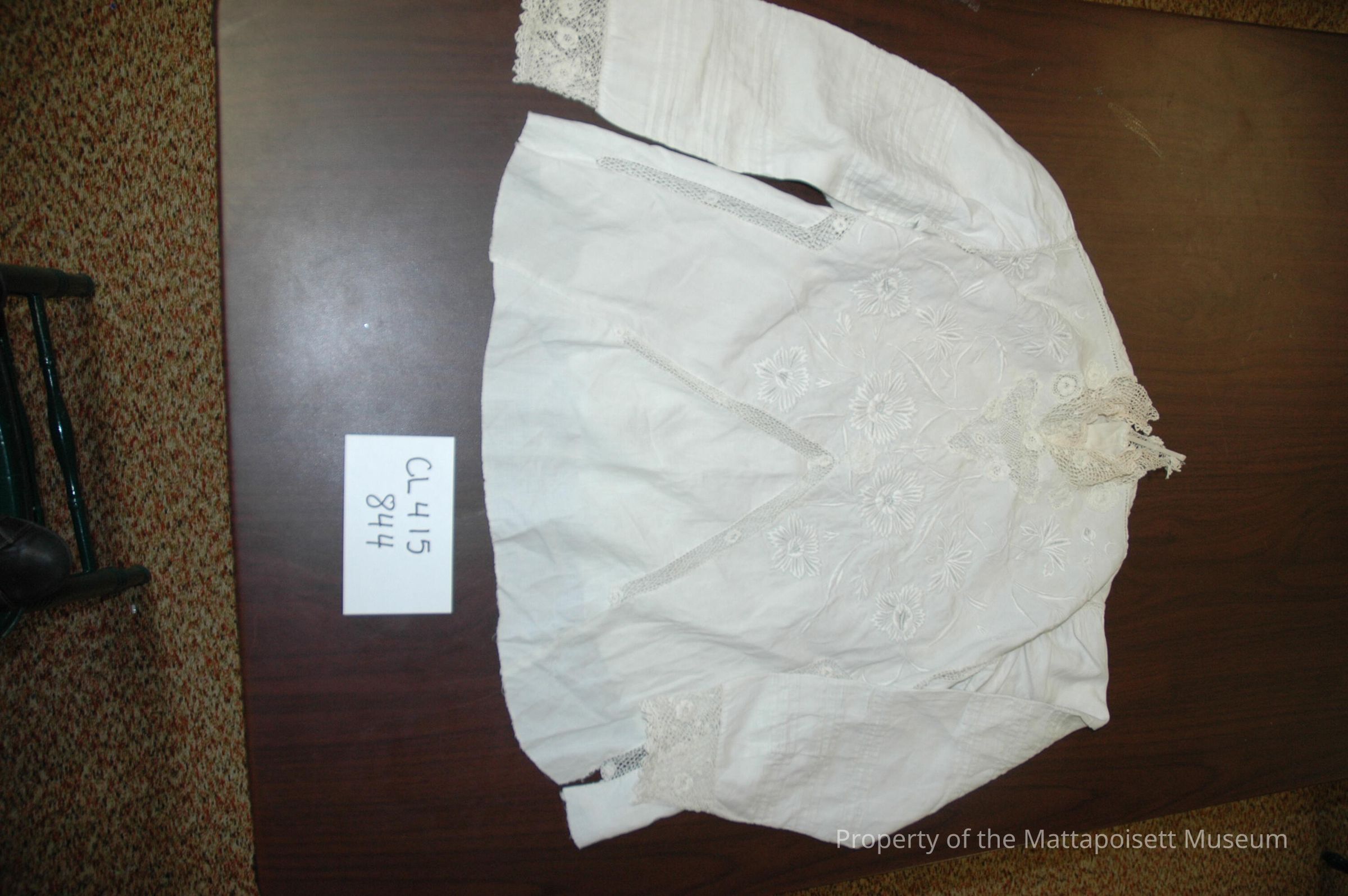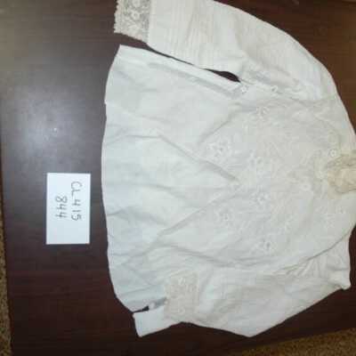 White cotton waist. Heavy embroidery. Crocheted trim at neck and cuffs. Tucking on sleeves.Collection