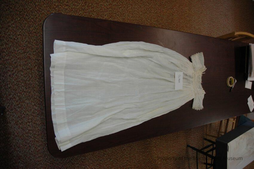 Christening gown. Lace detail at neck. Crochet sleeves. Neck embroidered with lace trim.Collection