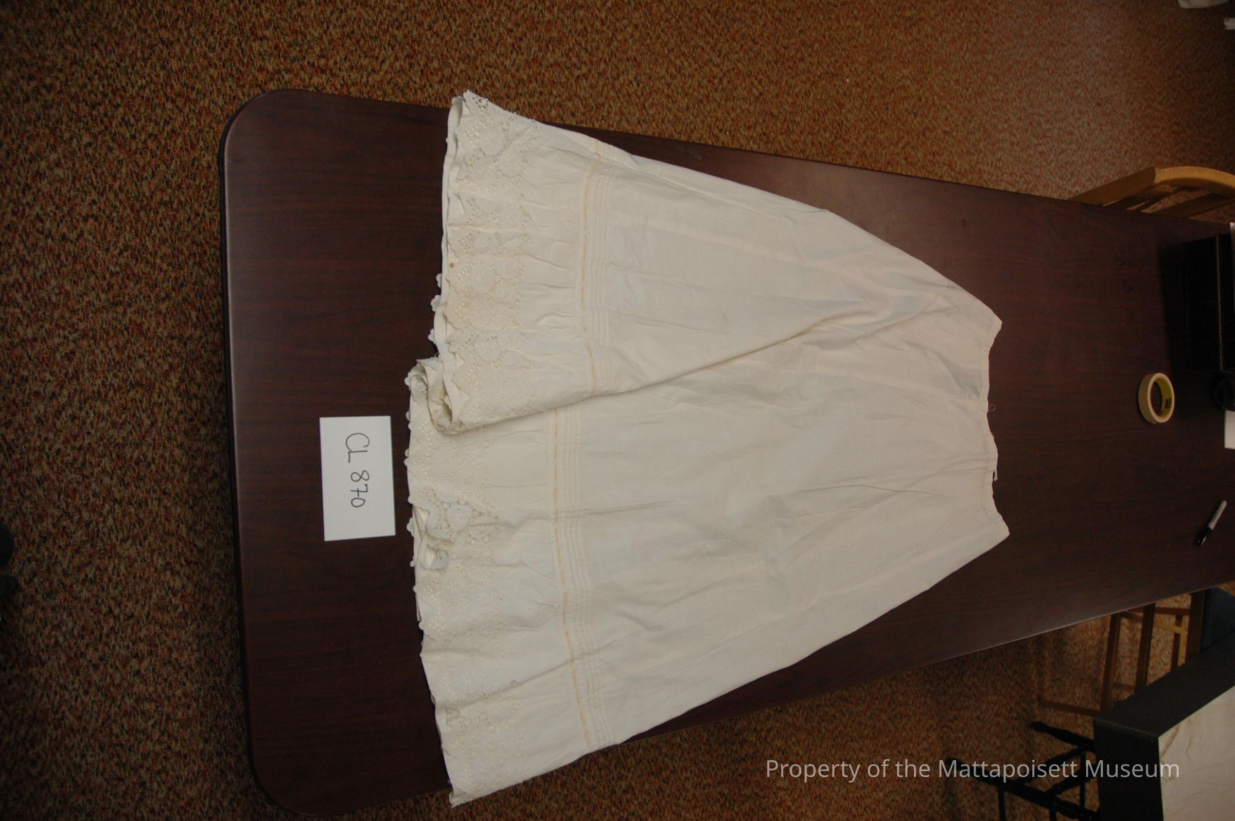 Petticoat. Gros grain ribbon trim at hem. Embroidered hem, tucking at hem. Tie waist.Collection