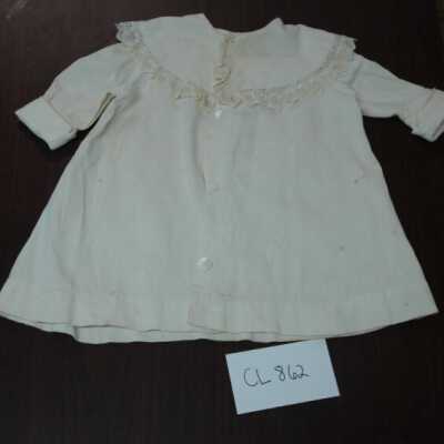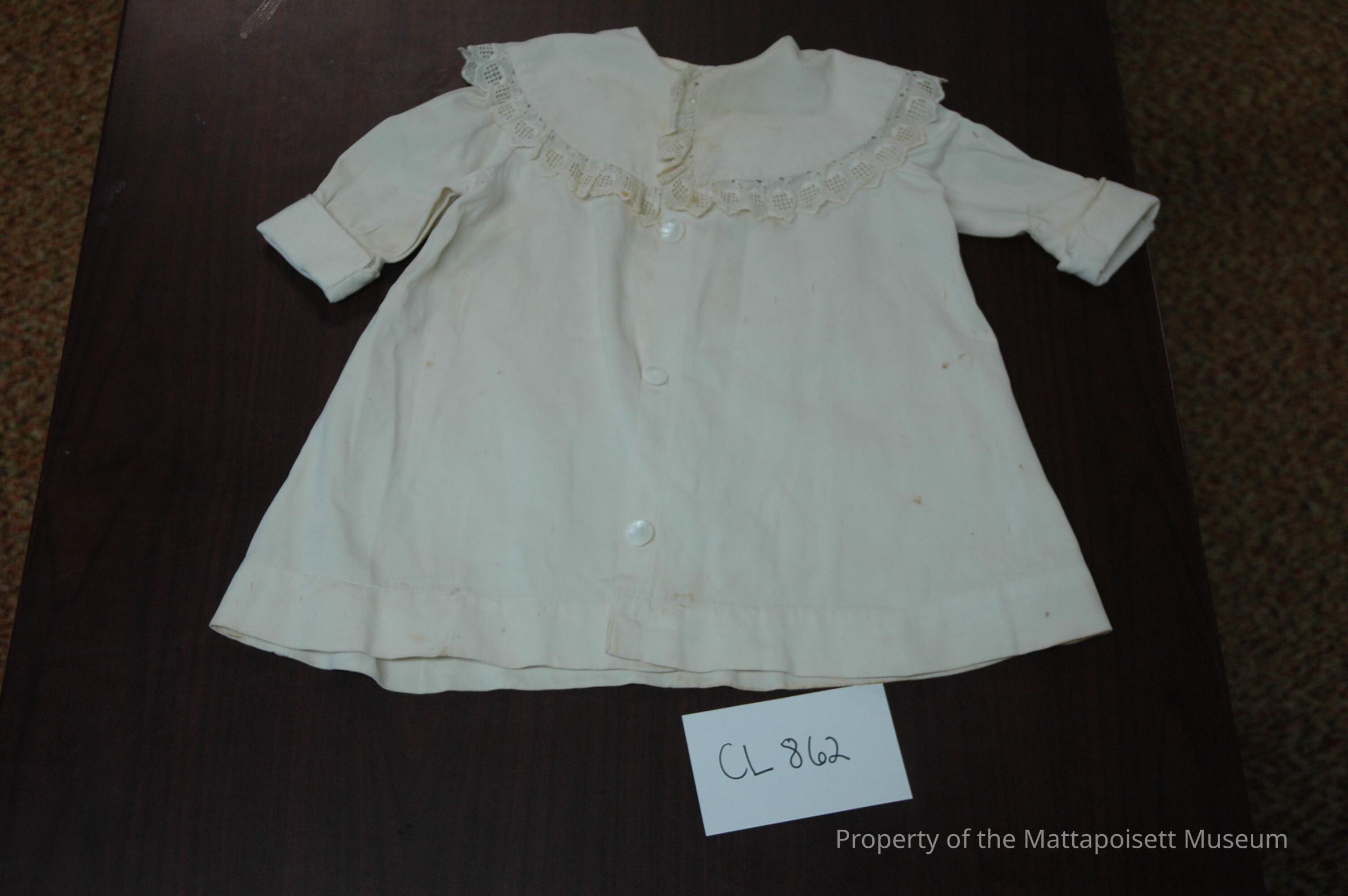 Child's white cotton coat. Large collar, eyelet trim. Four mother-of-pearl buttons down the front.Collection
