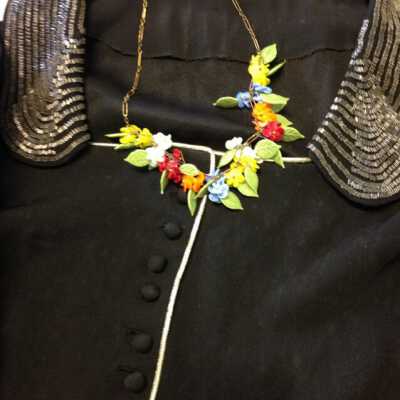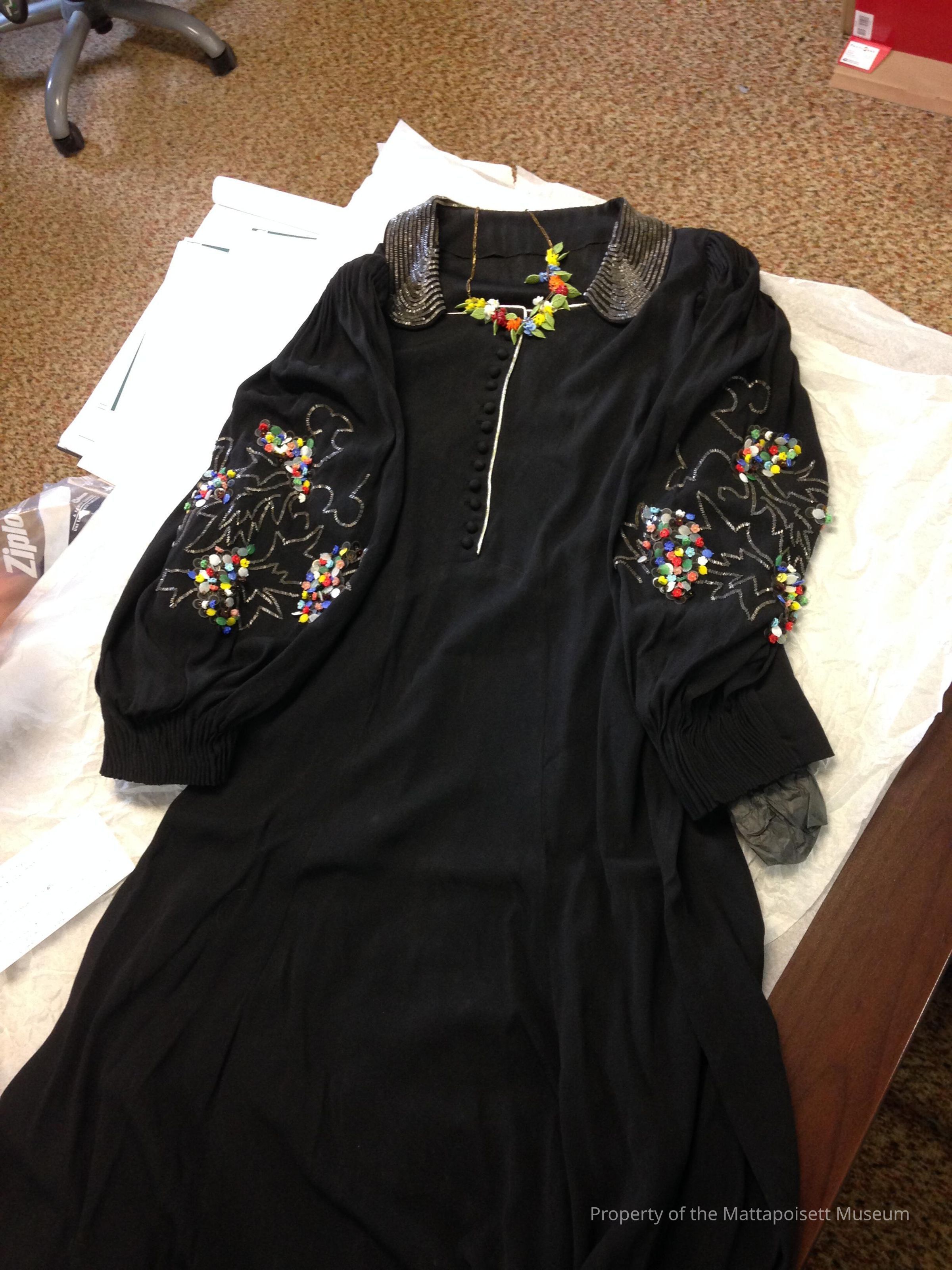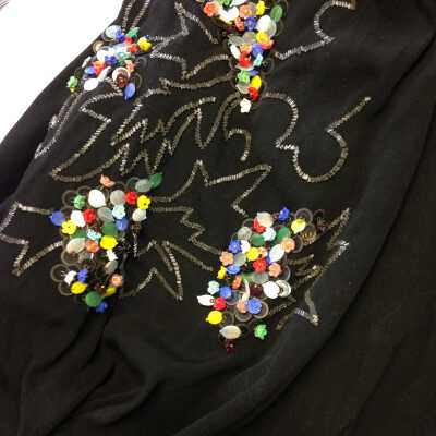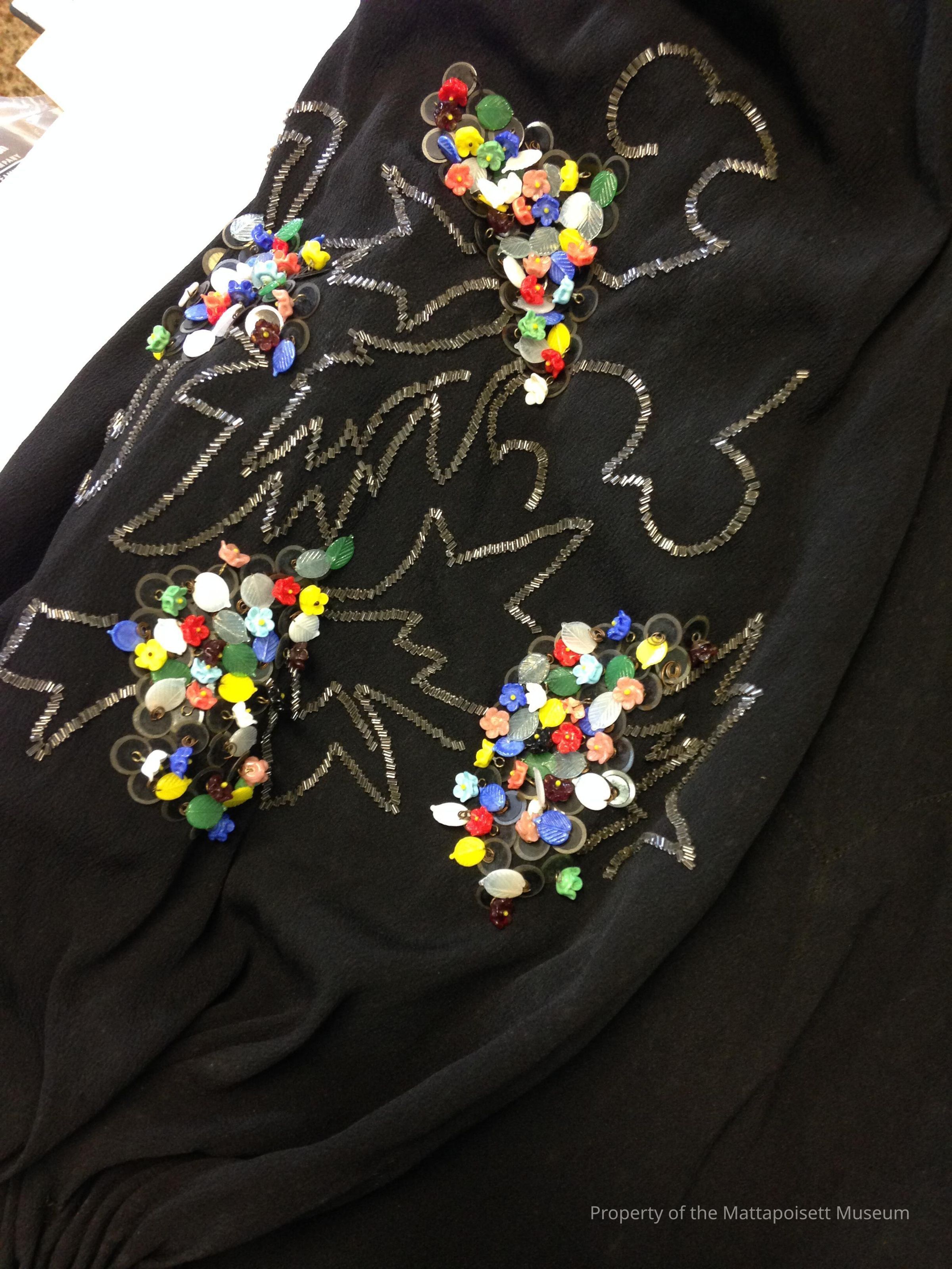 Black crepe dress. Long sleeves, silver ornamentation beaded at collar. Bakelite. Many colored flowers on sleeves.Collection