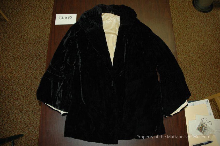 Black velvet jacket with shawl, pleated collar and lapels. Flounce at wrist. Satin lining.Collection