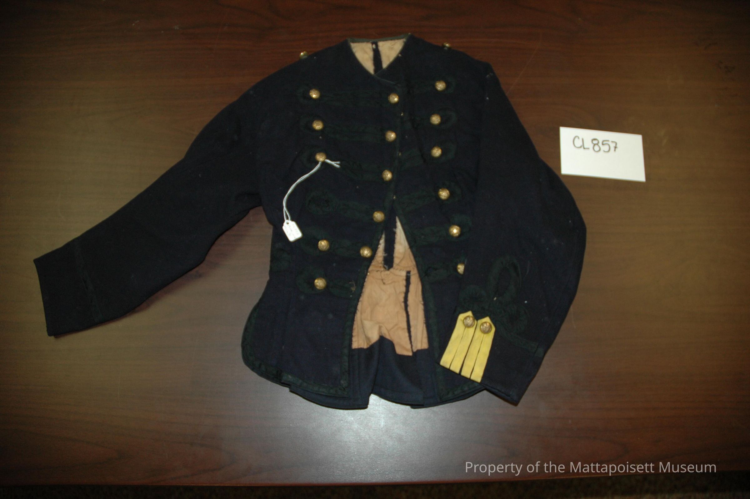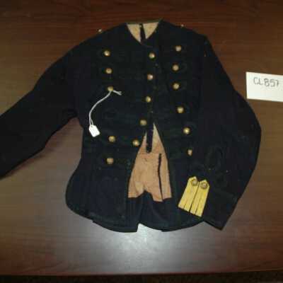 Ladies blue jacket. Wool. Black frogging detail on treble row of gold buttons. Buttons at shoulder and wrist. Button back waist.Collection