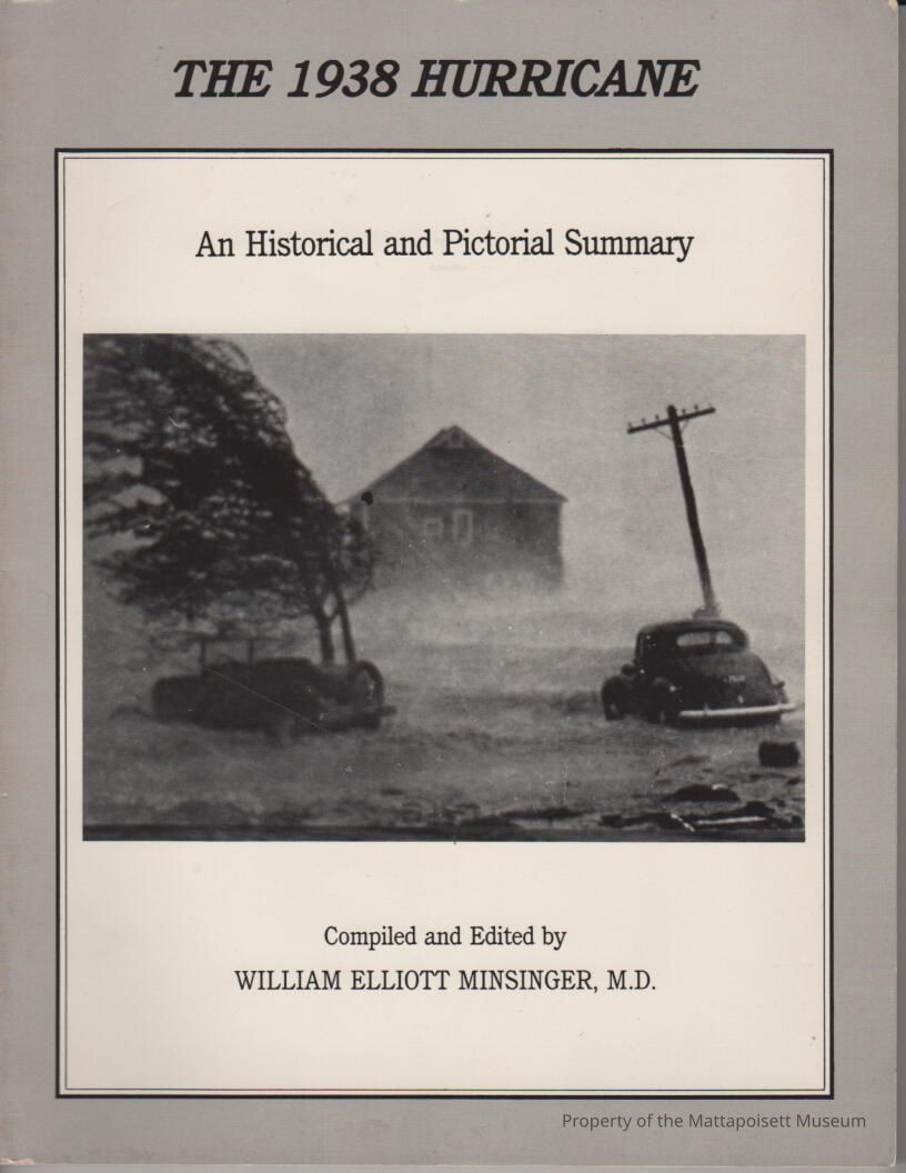 Book "The 1938 Hurricane-an Historical and Pictorial Summary" compiled and edited by Wiliam Elliott Minsinger, M.D. Published in 1988 by Blue Hill Observatory. Signed by editor. 128 pages. articles about the storm, historic perspective, structure of storm, and flooding and 91 pages of photographs with descriptive captions.Acquisition