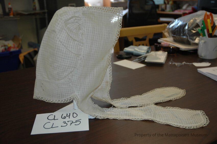Bonnet embroidered with lace trim, sheer organdy. Tie little button.Collection