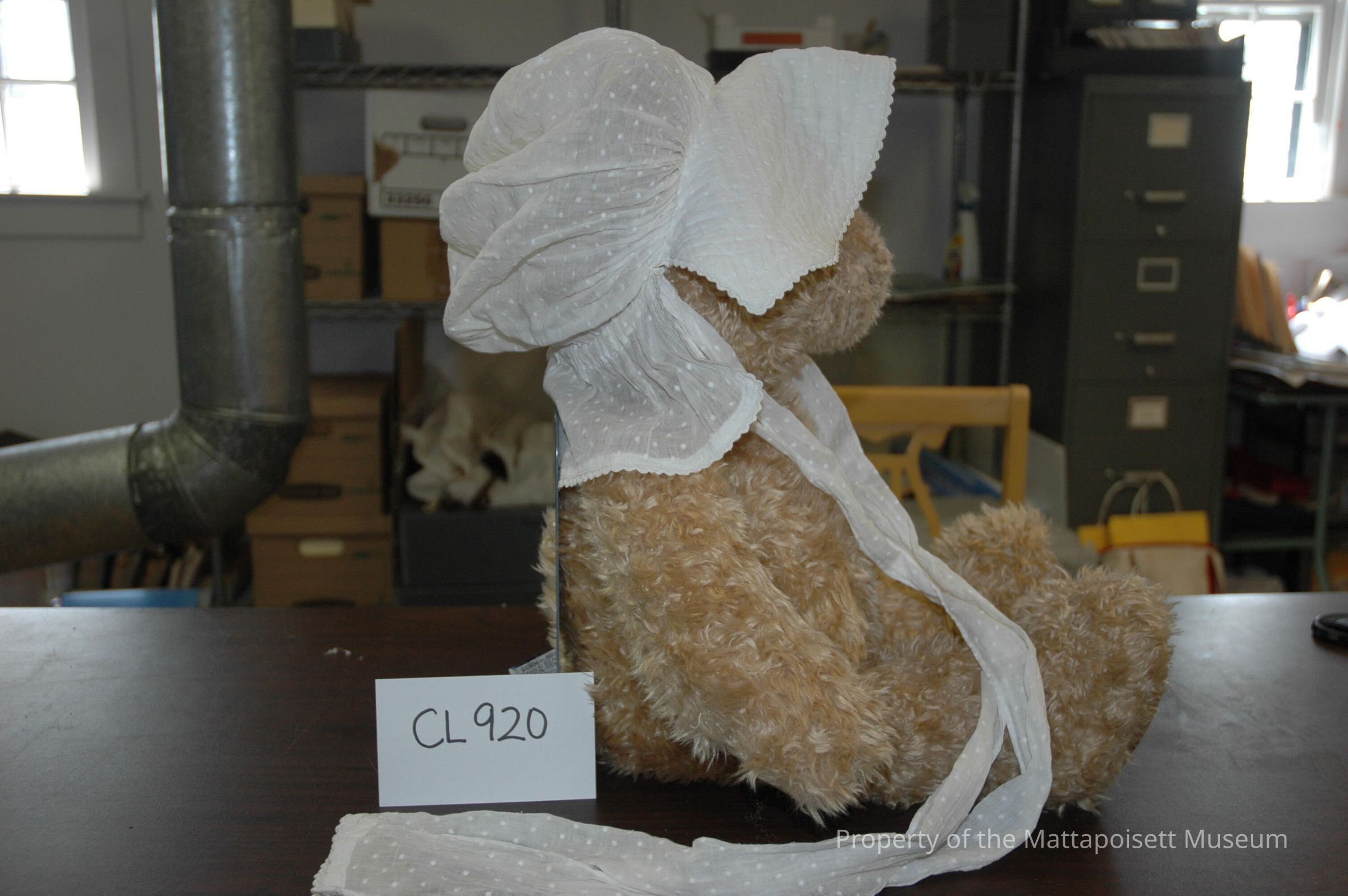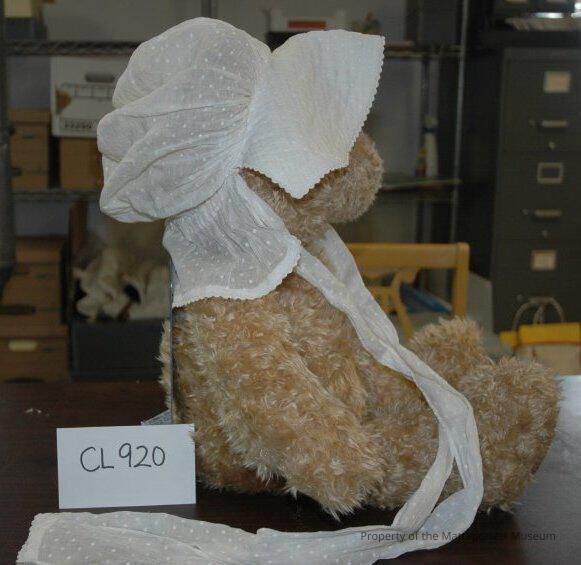 Dotted Swiss bonnet, quilted. Brim with ric-rac trim.Collection
