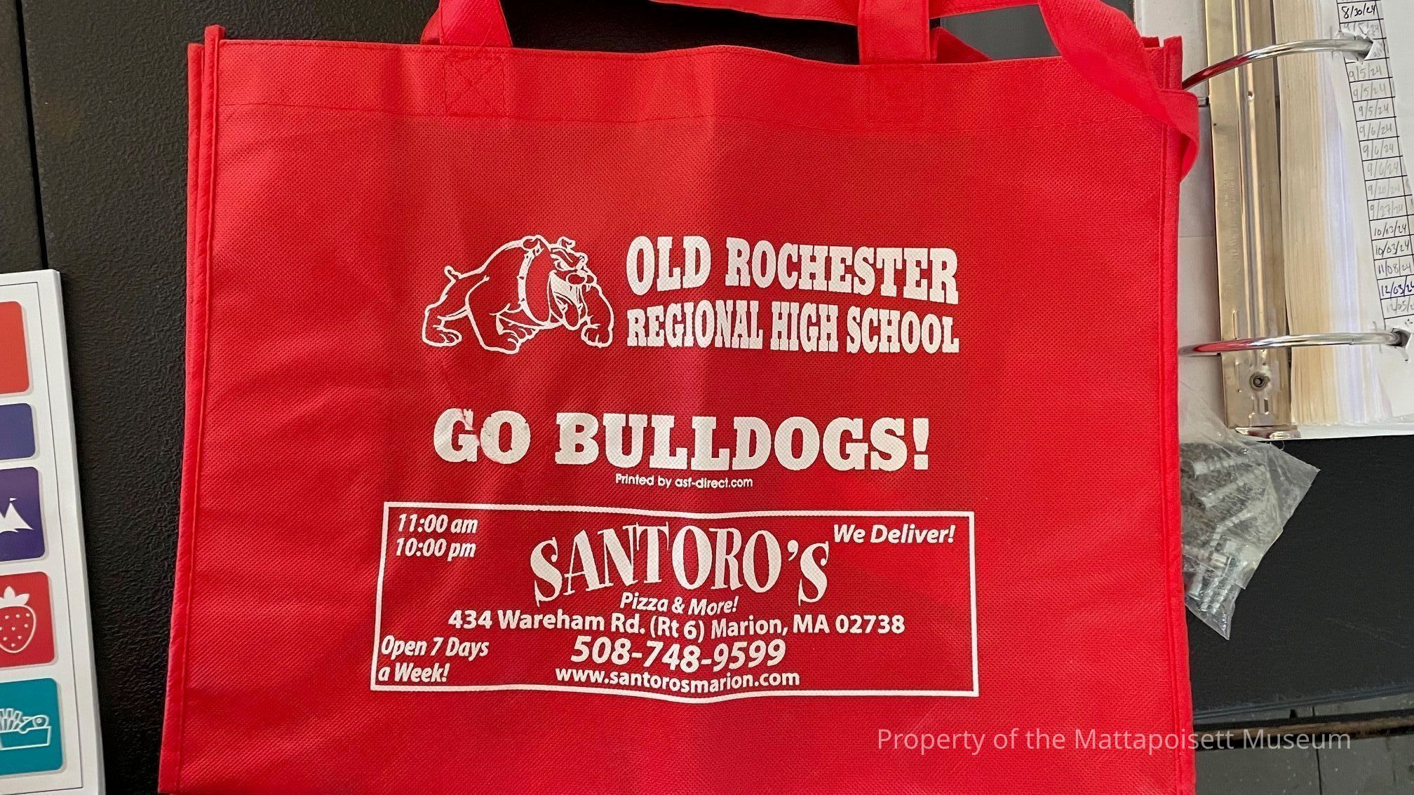 Promotional tote bag with a log of the bulldog mascot from ORR with Old Rochester Regional High School and Go Bulldogs printed as well. Ad for Santoro's pizzeria below.Acquisition