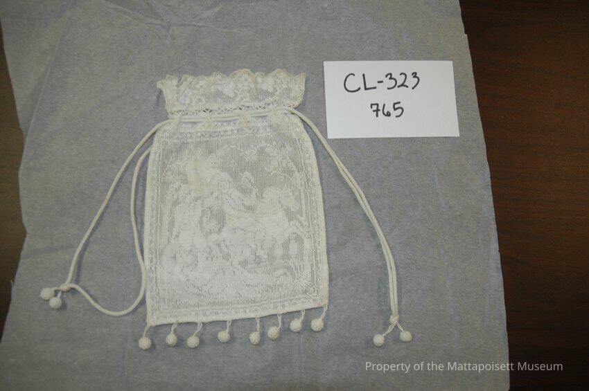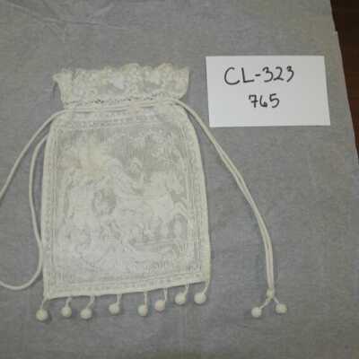 Small white crocheted reticule. Scene of man on horse. White ball fringe.