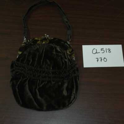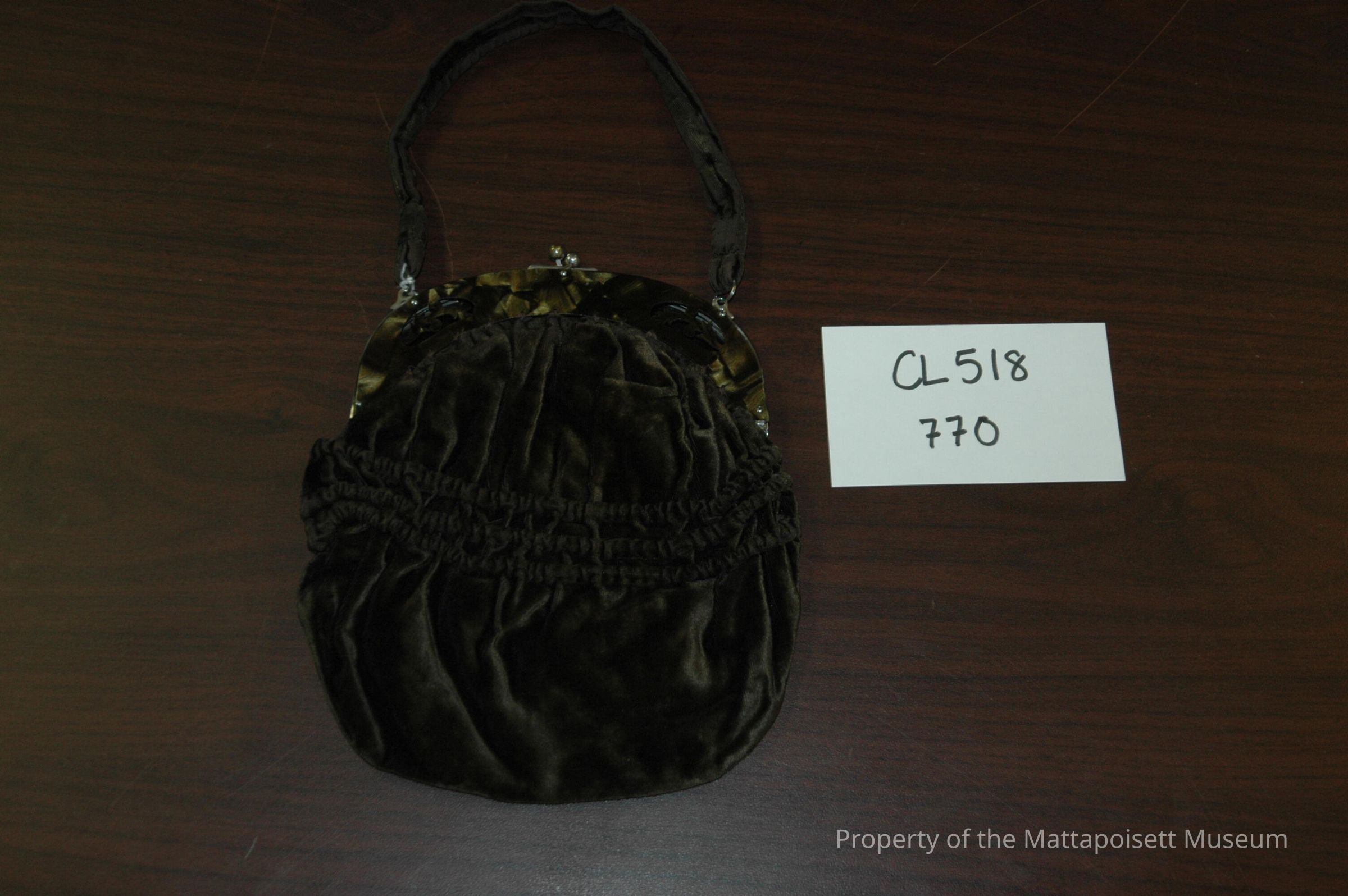 Green velvet bag with celluloid shell top with curved flowers. Silver-like trim.