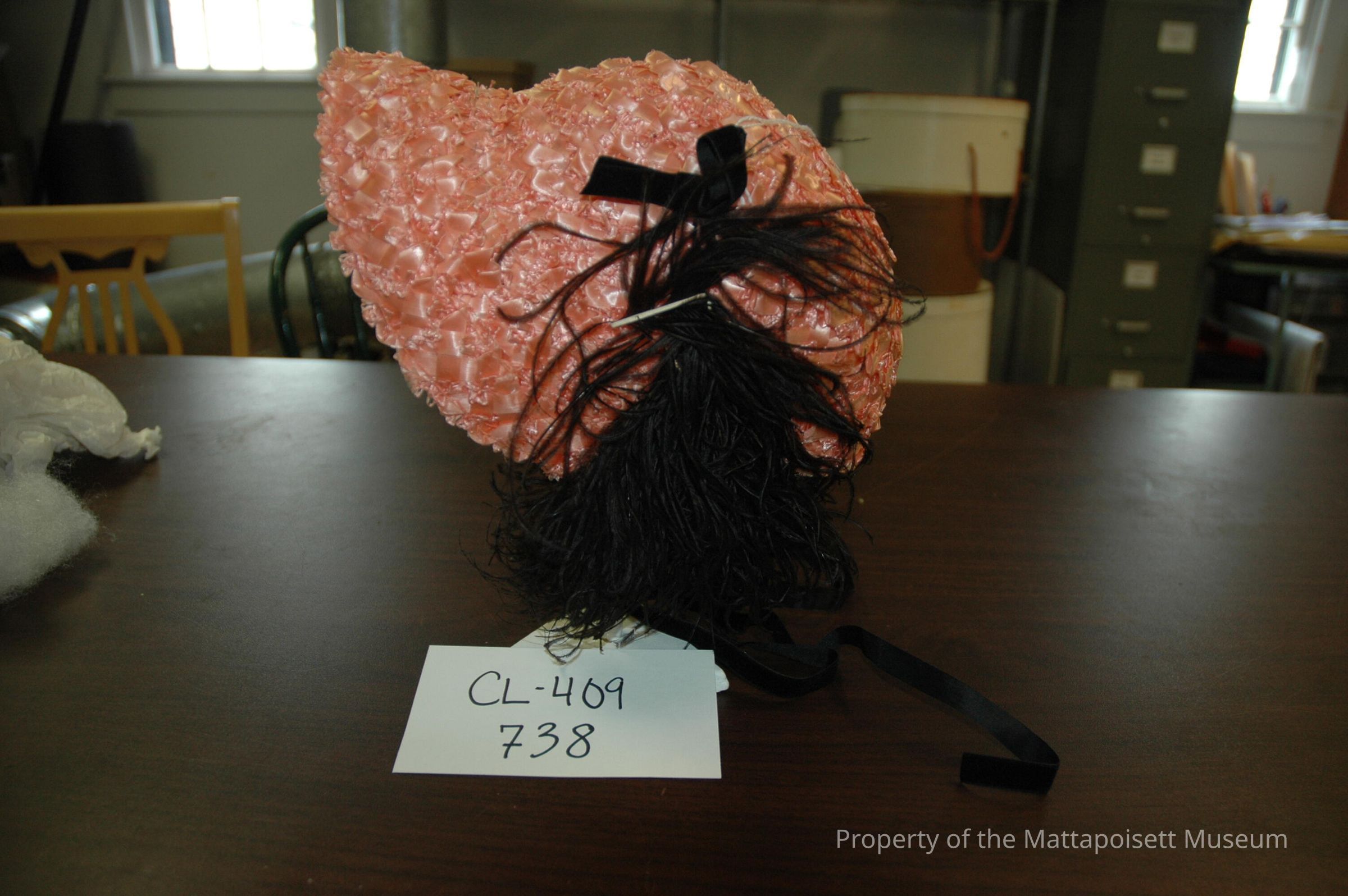 Shrimp colored raffia hat with black long ribbons and ostrich feathers.Collection