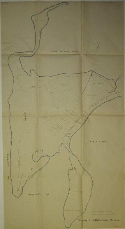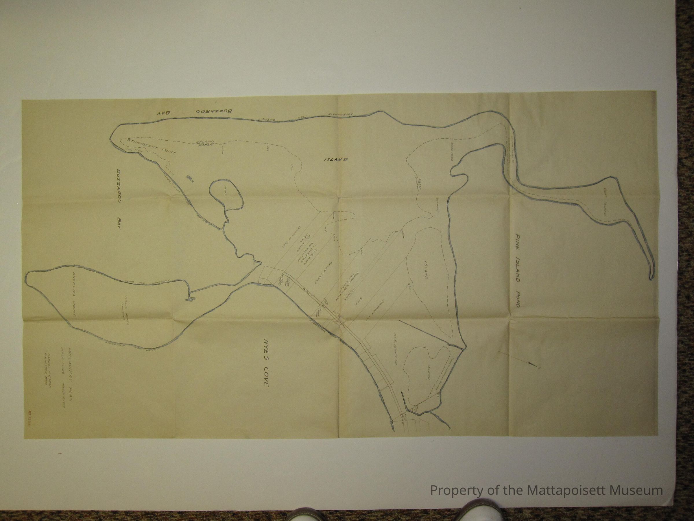 Preliminary plan March 10, 1939 (stamped April 12, 1939). Includes Goat Island, Strawberry Pond, Angelica Point, and Nyes Cove. Scale 1"=100'. Samuel H. Corse, surveyor. Owners' notes: Andrew Sisson to Lilburn Hiller, Abner Pease, Joseph R. Jenney, Ephraim Dexter, Crampton Lot, Shaw, Stackpole, Bowman to Valentine (Book 1668, Page 205), George Church, Ellen Hiller to Covil, Church to Covil. Marked with Old# MP-6Collection
