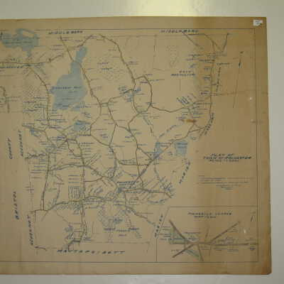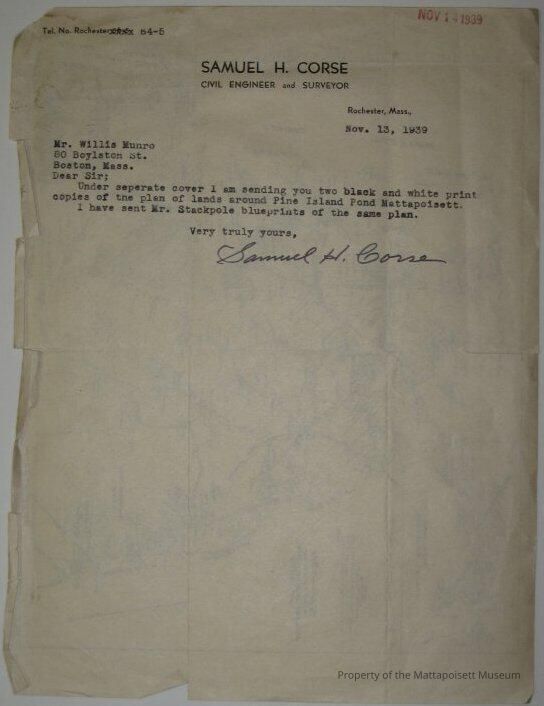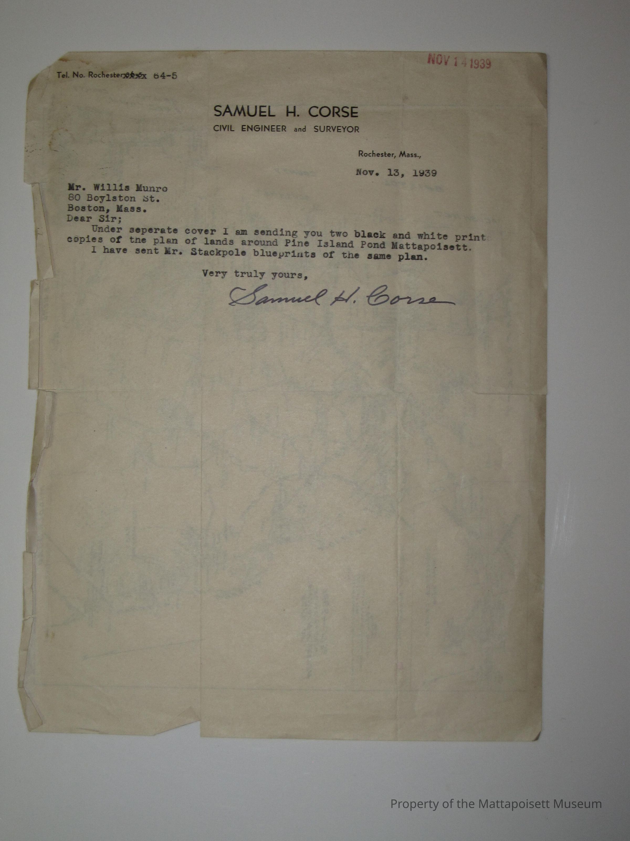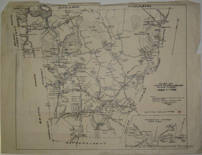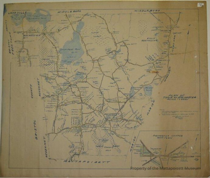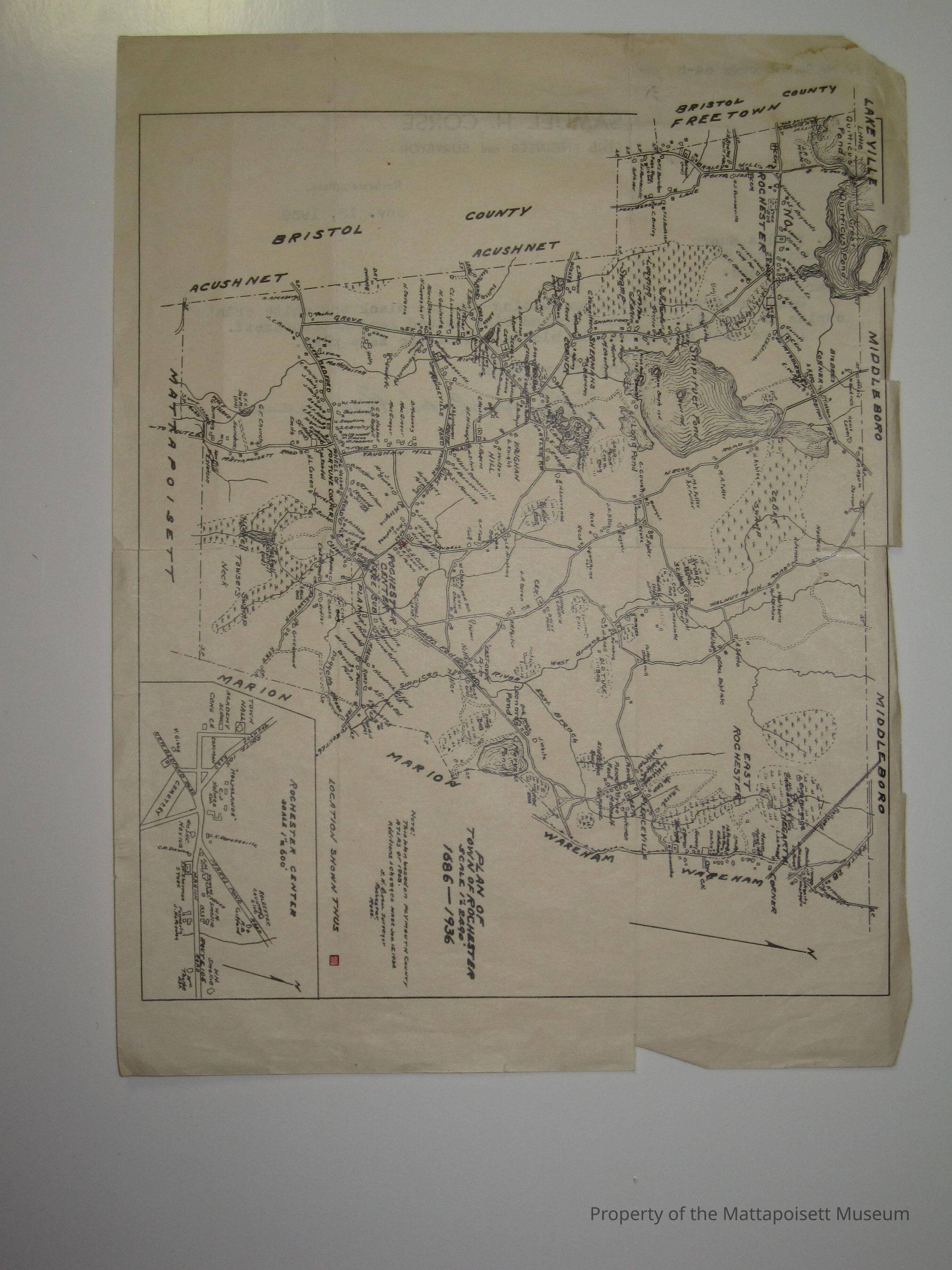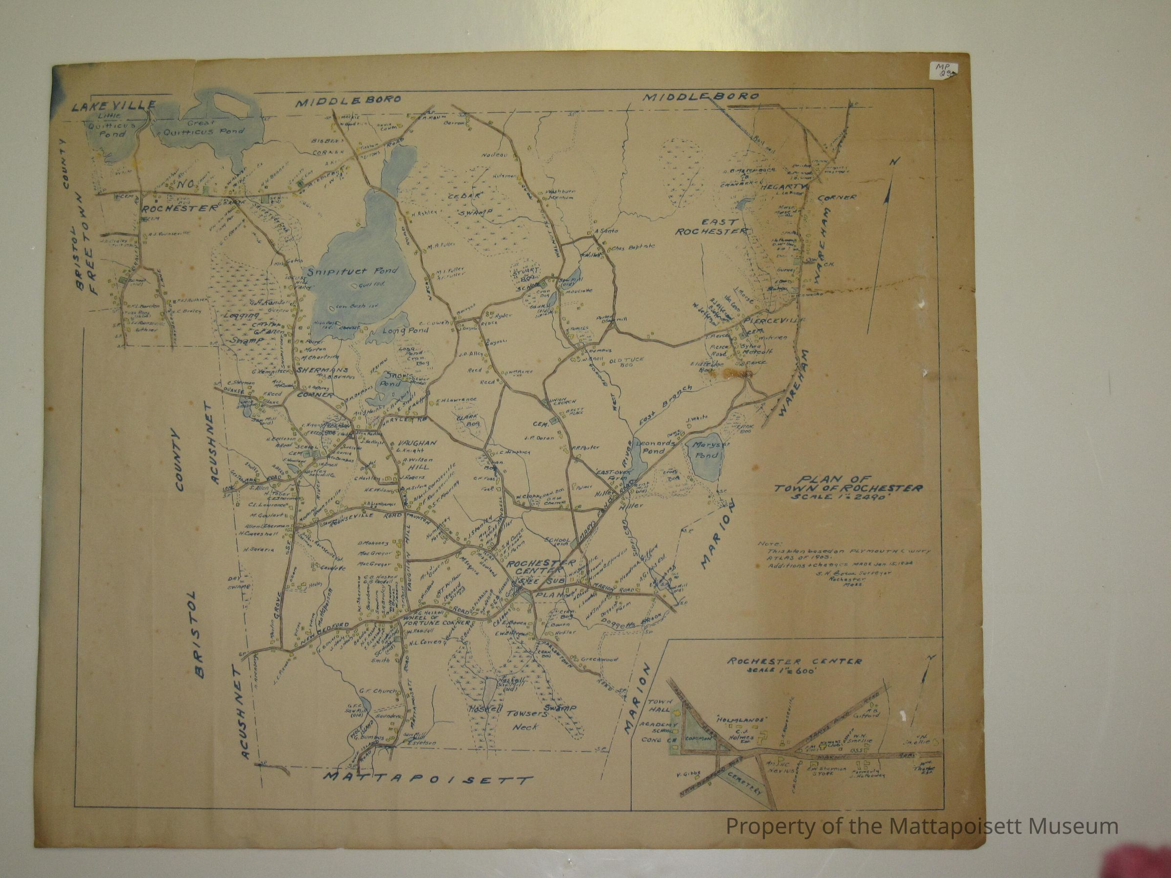 Plan of Town of Rochester. Scale 1"=2490'. 1686-1936. Note: This plan based on Plymouth County Atlast of 1903. Additions and changes made January 15, 1934. S. H. Corse, Surveyor, Rochester, Mass. Inset of Rochester Center. 3 maps total. One is large (17x20) and two are small (8x10). Two are marked with MP-23. The third (a small) has a letter from Samuel H. Corse to Mr. Willis Munro on the back. Dear Sir; Under separate cover I am sending you two black and white print copies of the plan of lands around Pine Island Pond, Mattapiosett. I have sent Mr. Stackpole blueprints of the same plan. Very truly yours. Dated November 13, 1939.Collection