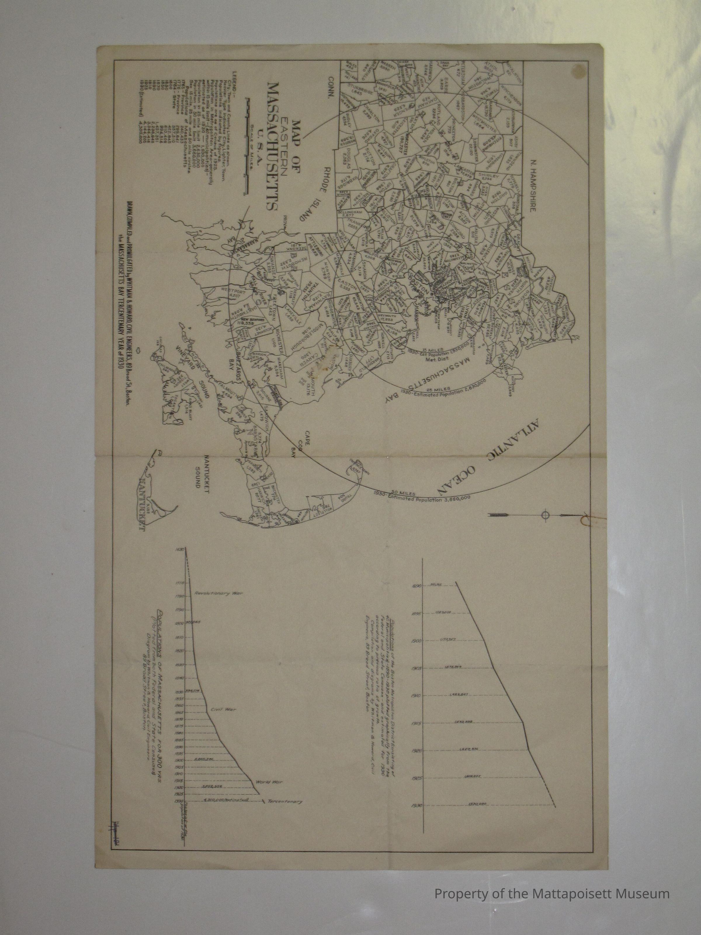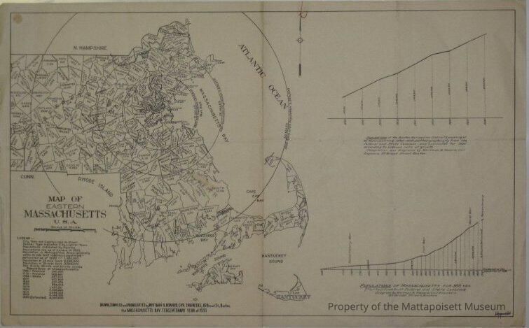 Map of Eastern Massachusetts. Drawn, Compiled and promulgated by Whitman & Howard, Civil Engineers, 89 Broad Street, Boston. The Massachusetts Bay Tercentenary Year of 1930. Includes graphs of the Populations of Boston Metropolitan District from 1890-1930 and Populations of Massachusetts for 300 years. Map was marked with MP-12, but matching card is MP-19.Collection