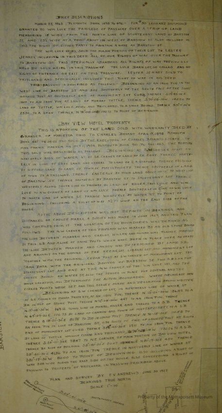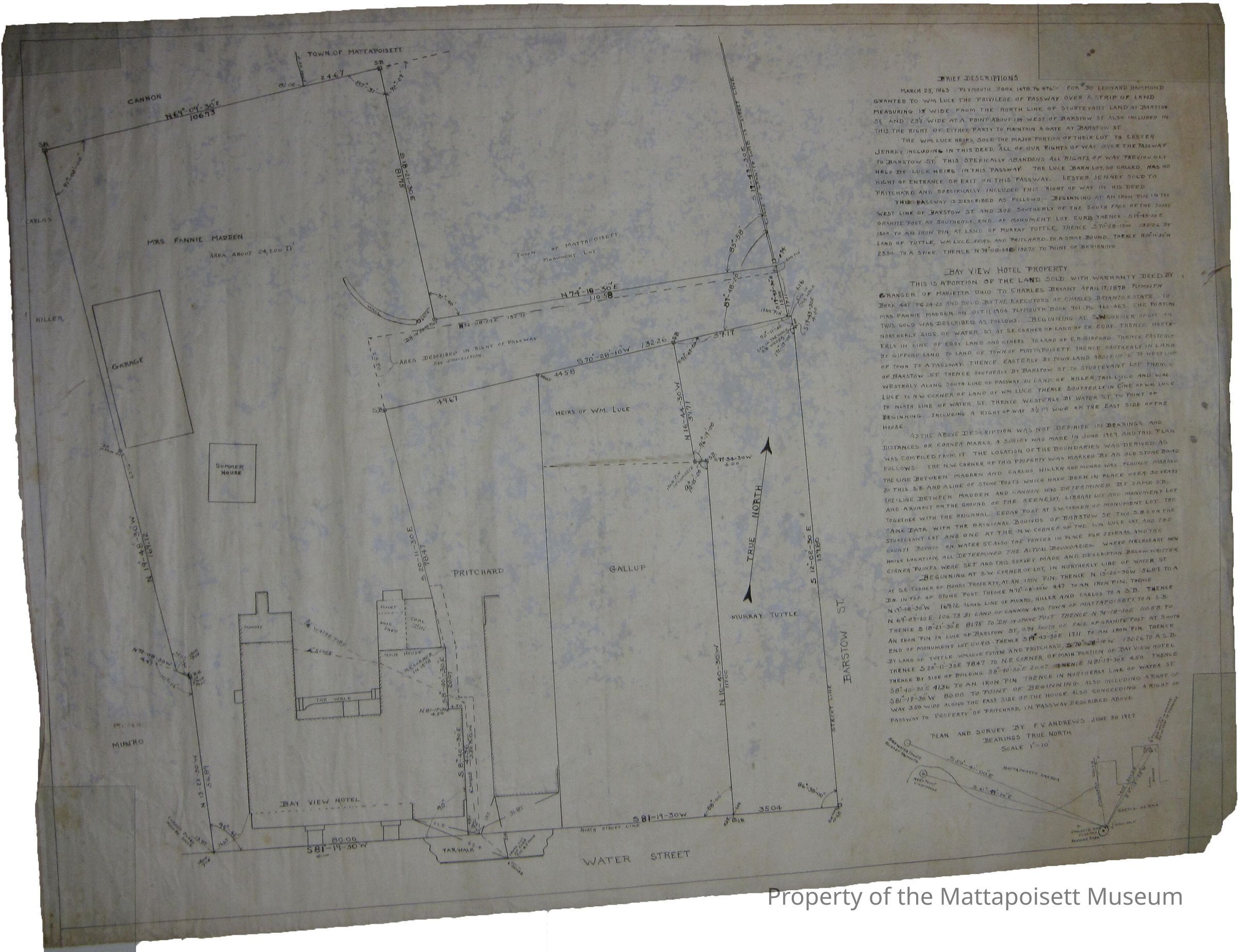 Plan and survey by F. V. Andrews, June 30, 1927. Scale 1"=10'. Plans for Bayview Hotel property.Collection