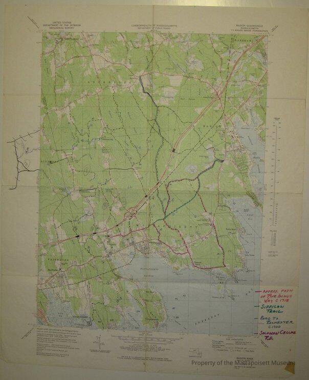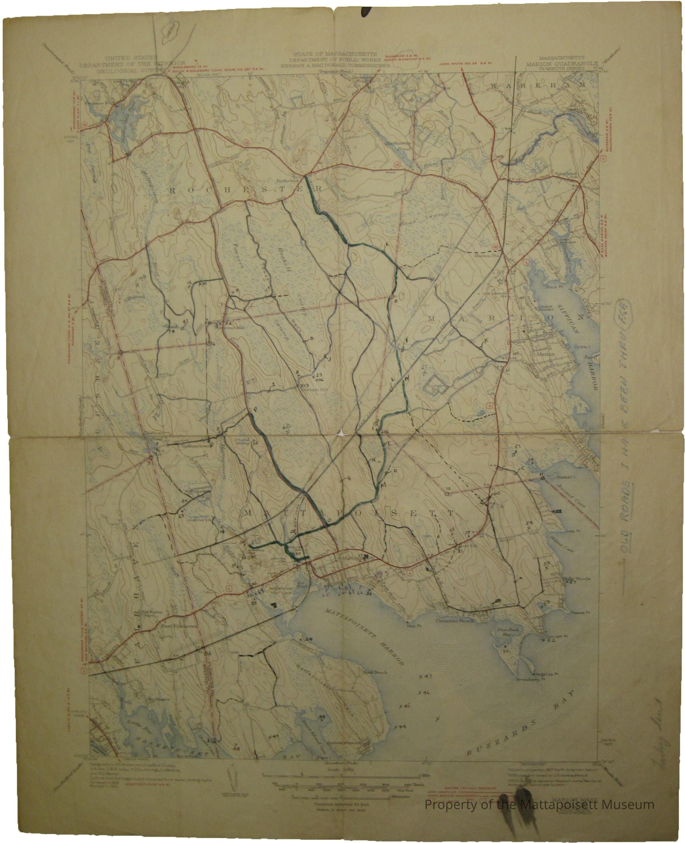 Marion Quadrangle, Massachusetts, 7.5 minute series (topographic). Commonwealth of Massachusetts, Department of Public Works. United States Department of the Interior Geological Survey. 1977. Hand marked with approximate path of Pine Island Way c. 1718, Sippican Trail, Road to Rochester c. 1700, Solomon Cellar Road. Second of the same map that says “Old Roads I have been thru (FGR)" poor quality.Collection