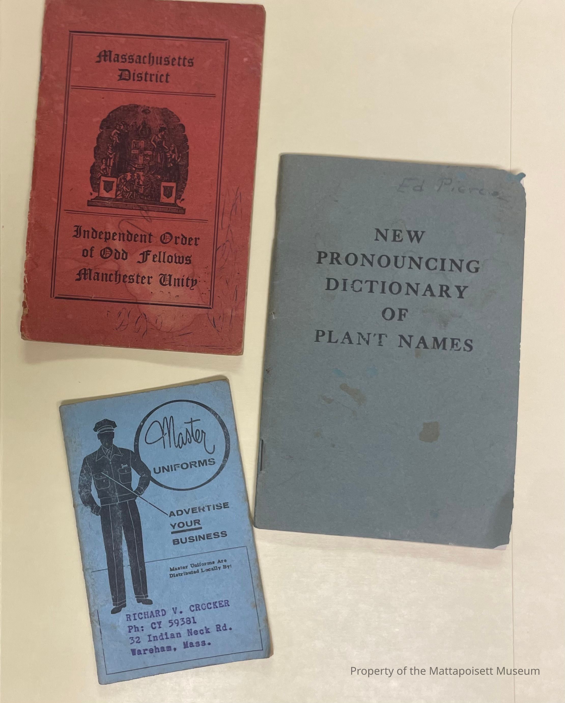 Collection of booklets: "Massachusettts District, Independent Order of Odd Fellows Manchester Unity"; "Master Uniforms"( Labeled "Richard Crocker"); "New Pronouncing Dictionary of Plant Names" (Labeled "Ed Pierce" and "Sippican Nursery Marion, MA")Context