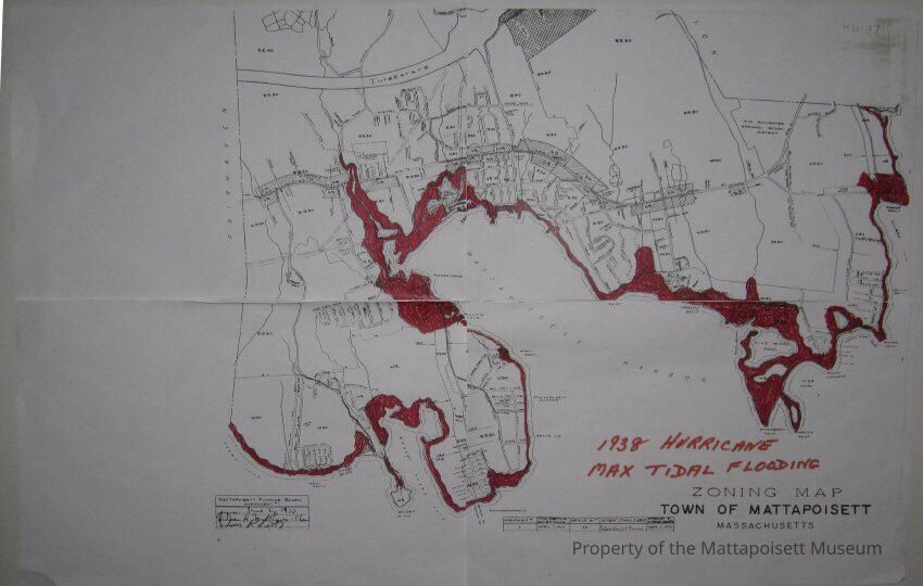 1938 Hurricane max tidal flooding markings on a zoning map of the Town of Mattapoisett, Massachusetts. The zoning map was approved by the planning board June 2, 1970. The map is 4 photocopies of original map taped together.Collection