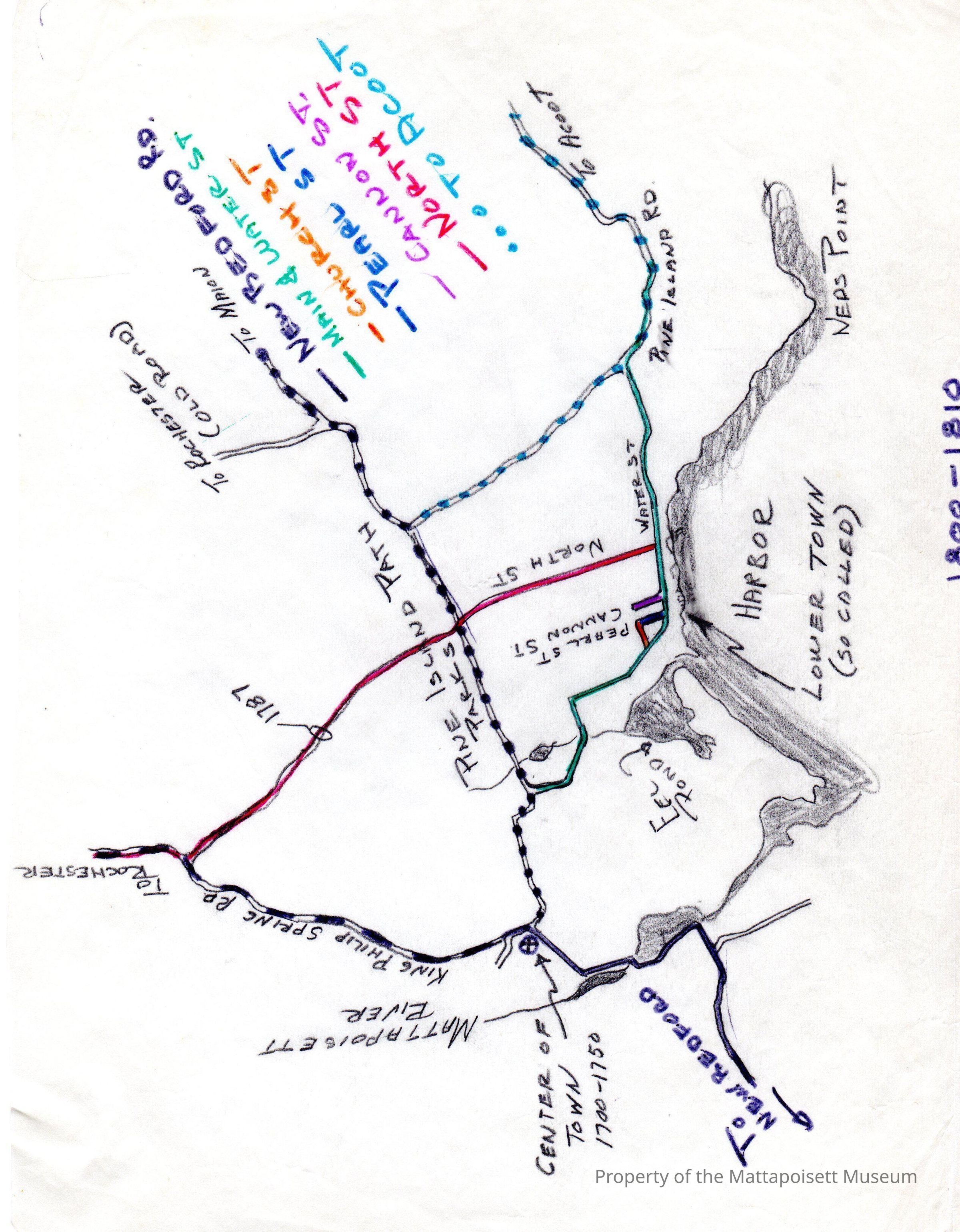 Handdrawn map of Mattapoisett. Center of town, 1700-1750, Mattapoisett River, King Philip Spring Road (to Rochester), Pine Island Path, Eel Pond, Harbor, Lower Town (so called), Pine Island Road (to Aucoot), Ned's Point marked. Water, Pearl, Cannon, North Streets marked.Collection