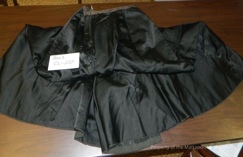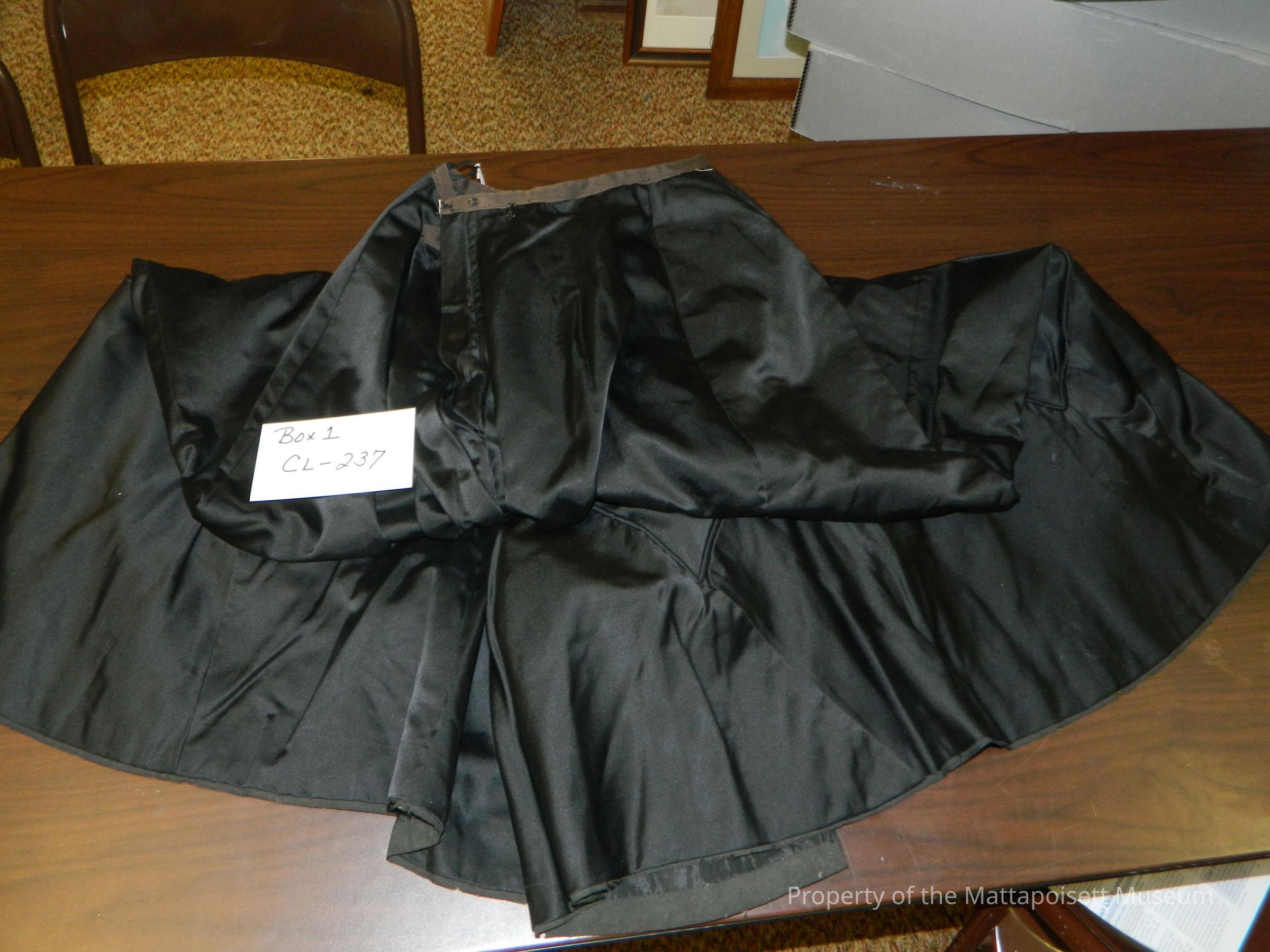 Black faille walking skirt. Corded piece added to bottom of skirt. Hook and eye closure.