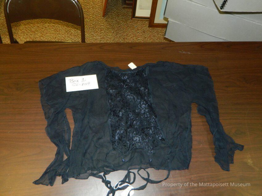 Navy sheer organza top with lce panel down the front with beading. Label reads: National Cloak and Suit Co. NY and Kansas City.Collection