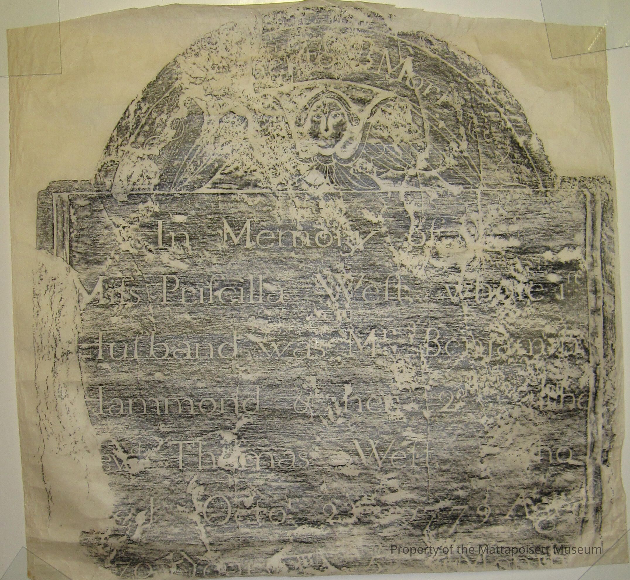In Memory of Priscilla West whose 1st husband was Mr. Benjamin Hammond and her 2nd husband was Rev. Thomas West, October 2nd 1779. (Hannah d. to Benj. June & wife Priscilla 12/25/1743. Priscilla b. 4/12/1741)Acquisition