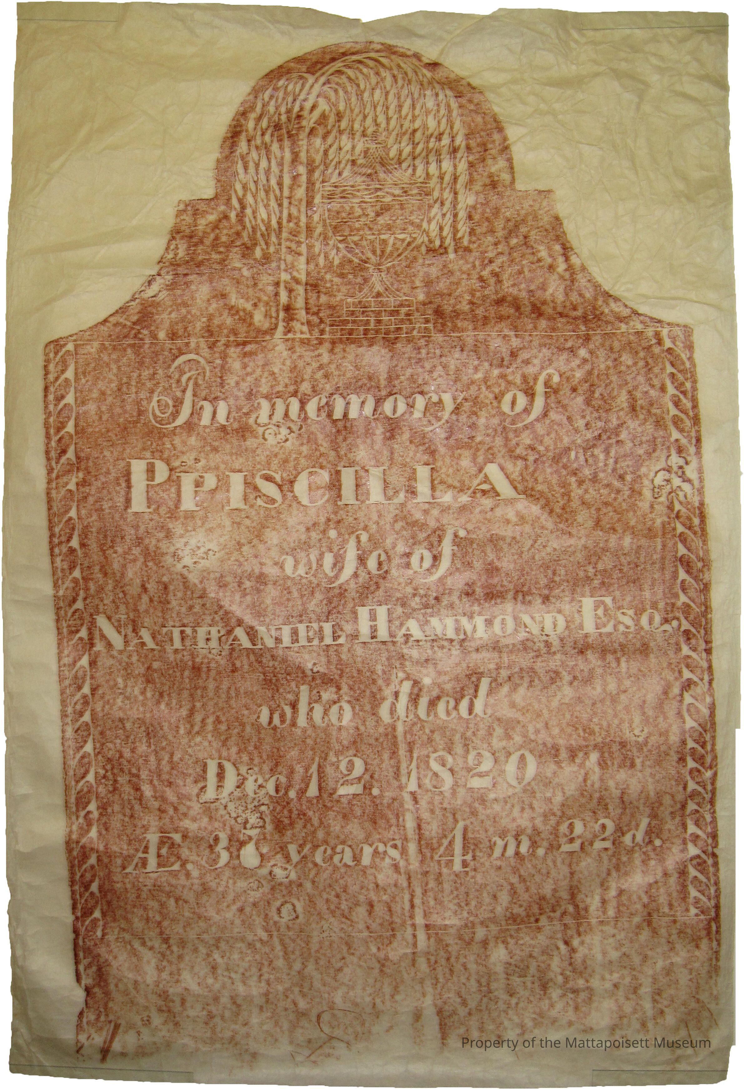In Memory of Priscilla wife of Nathaniel Hammond Esq. Dec. 12, 1820 at 37 years 4 months 22 days. (typical carving for the period, m. 10/30/1803)Acquisition