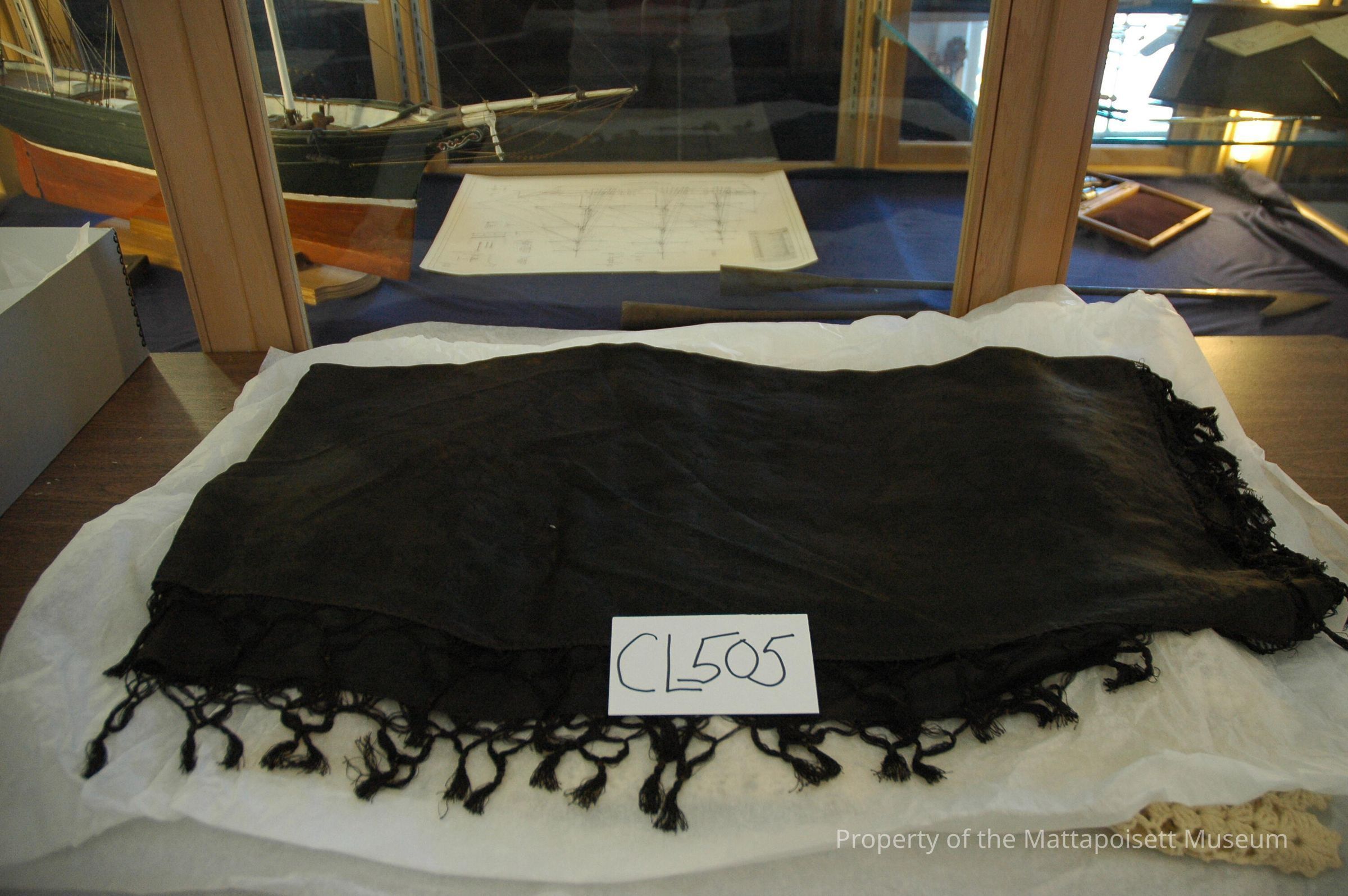 Notes: Notecard: Shawl, black silk brocade, stained/holes