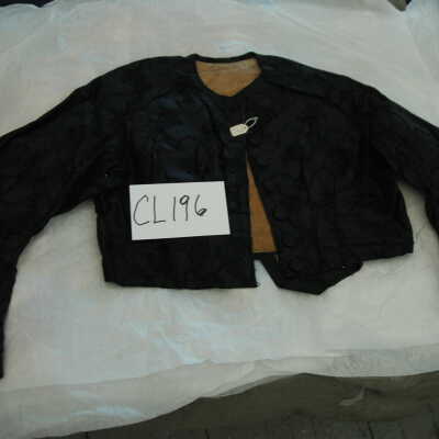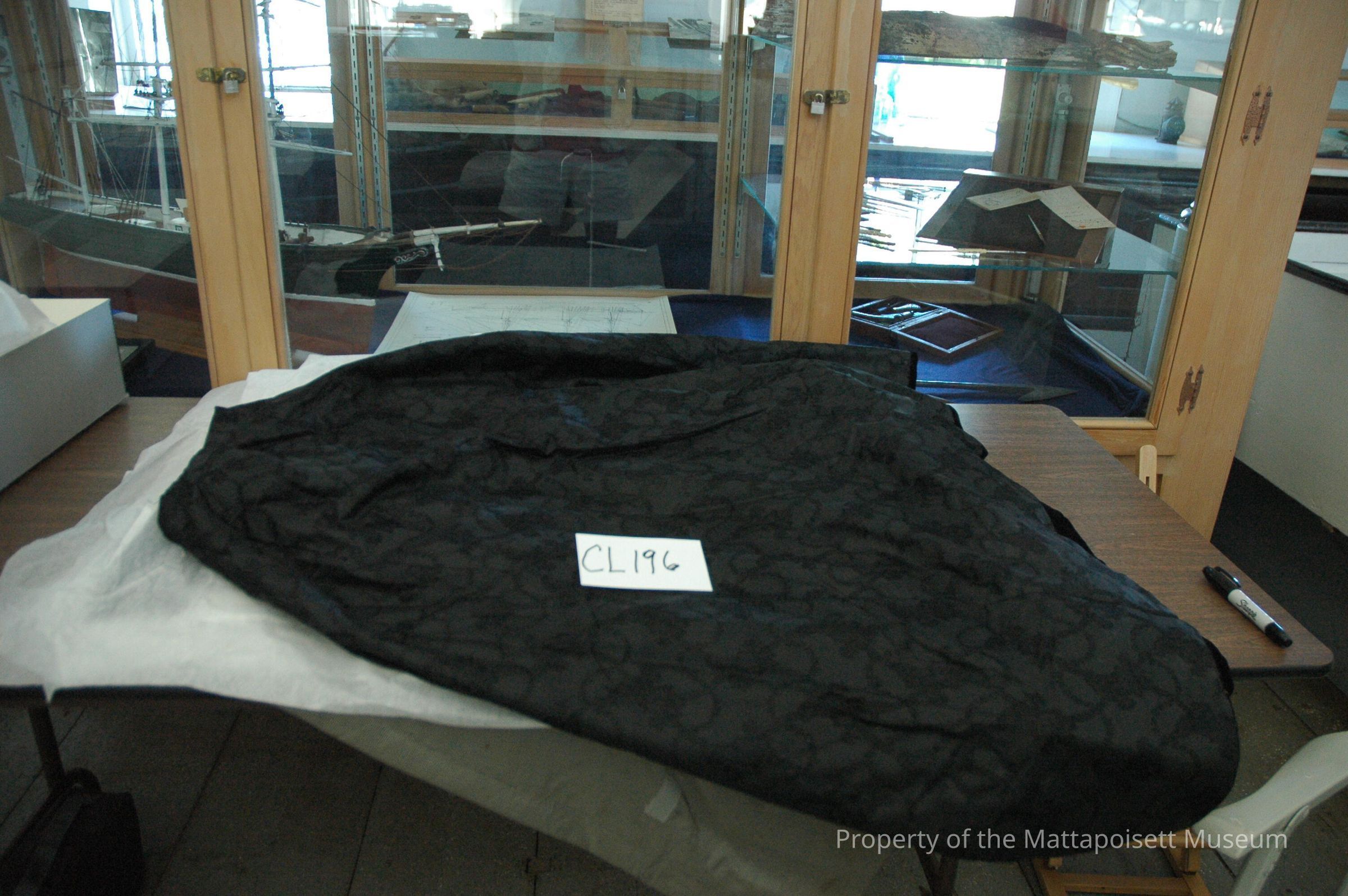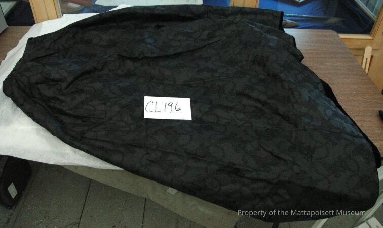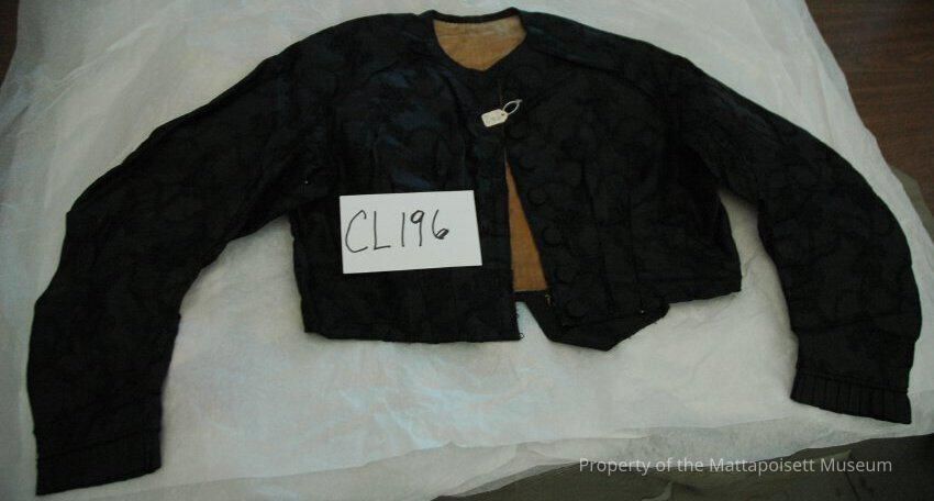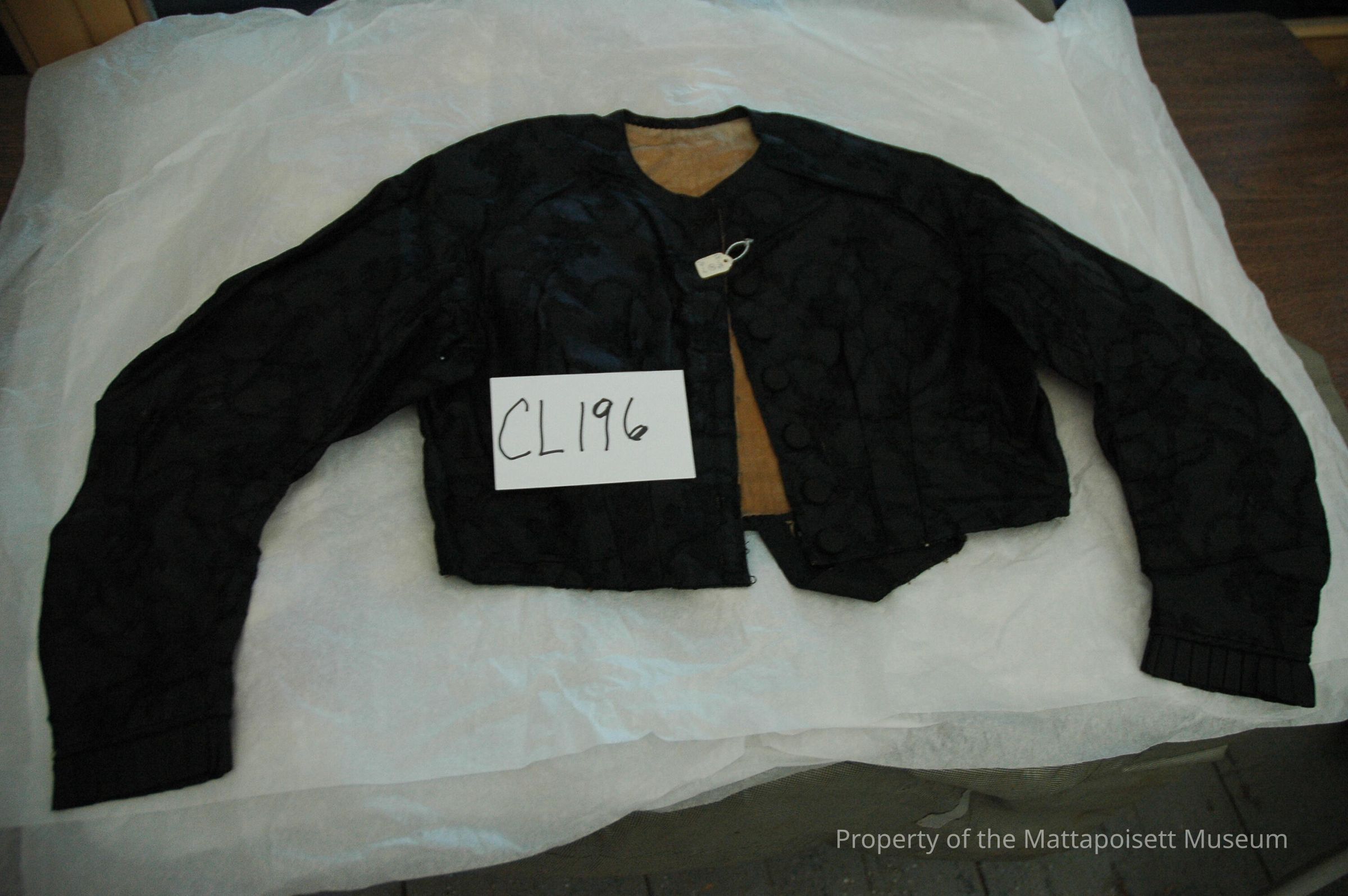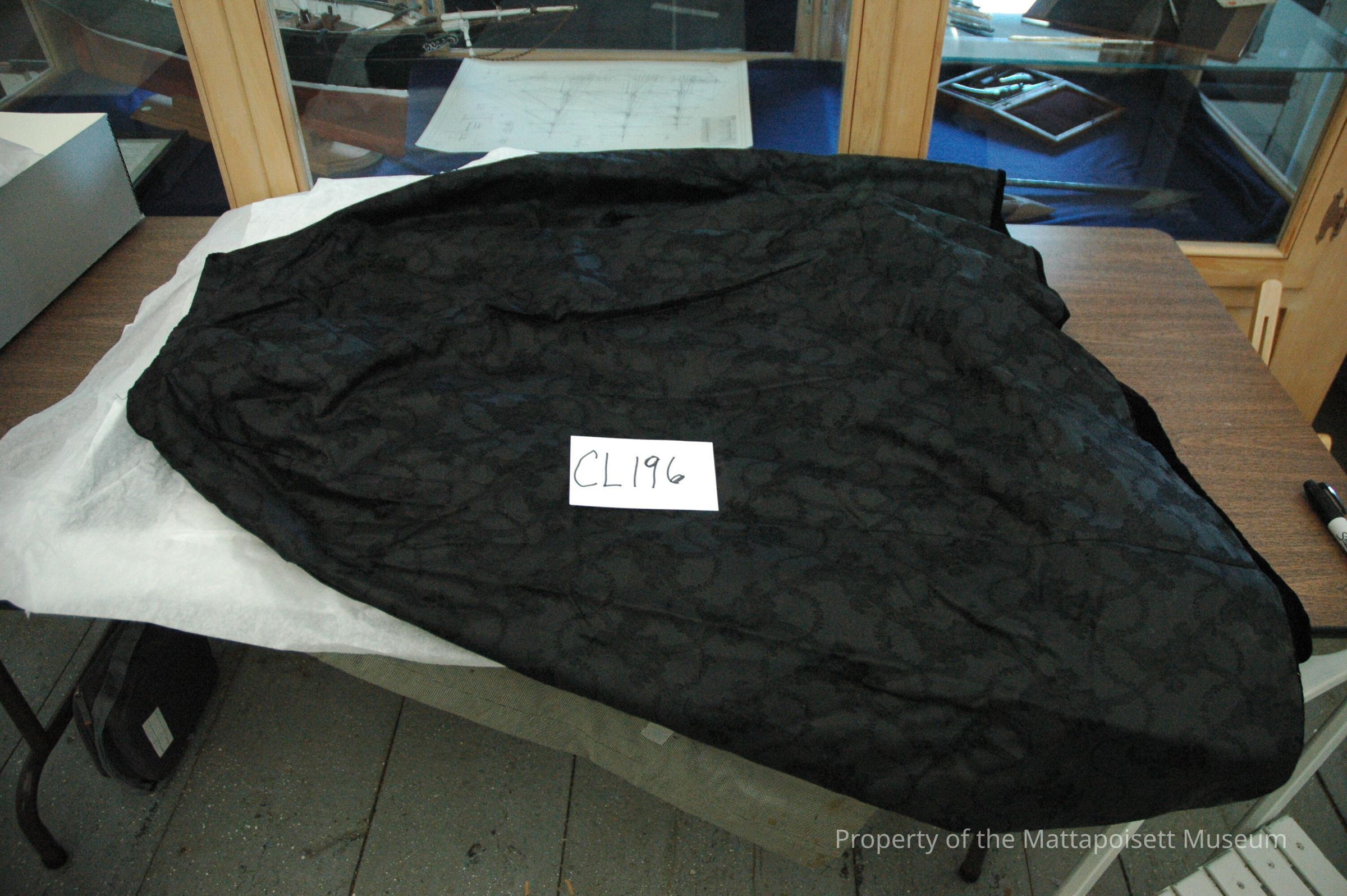 Two-piece black silk brocade jacket and skirt. Brown silk lining, jacket has grosgrain ribbons to attach it to skirt. Black velvet trim at hem.Collection