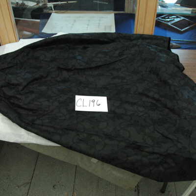 Notes: Notecard: Two-piece black dress with black floral pattern, covered buttons on waist with stays. Velvet trim on skirt hem.