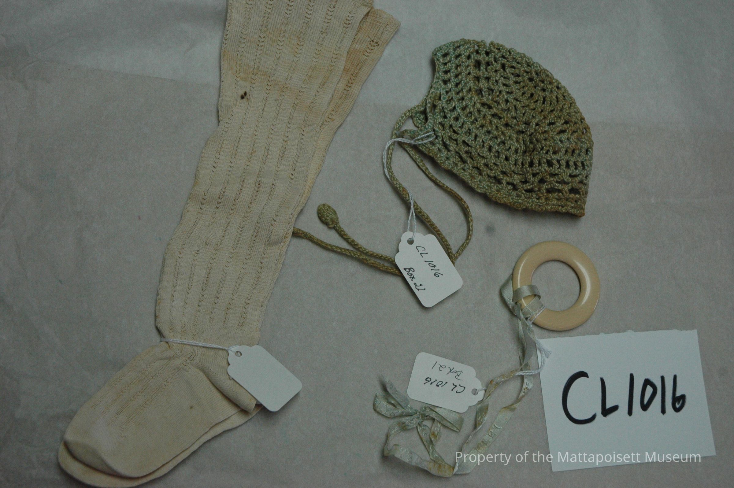 Three items: Crochet baby bonnet, light green (in Box 21). Bone teething ring with ribbon (in Box 21) and ecru baby socks (in Box 21).Collection