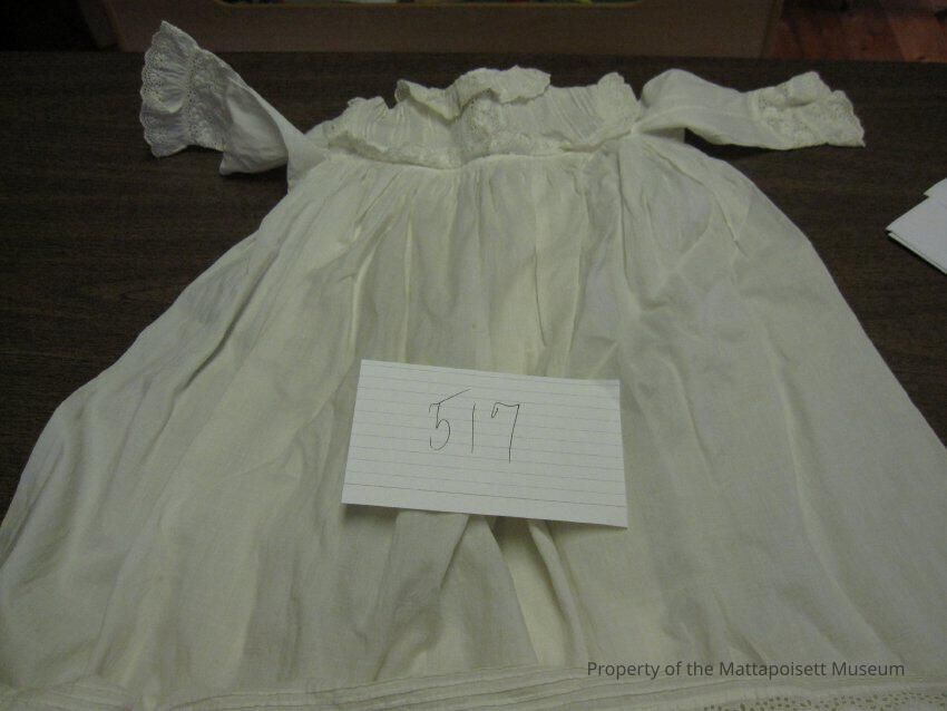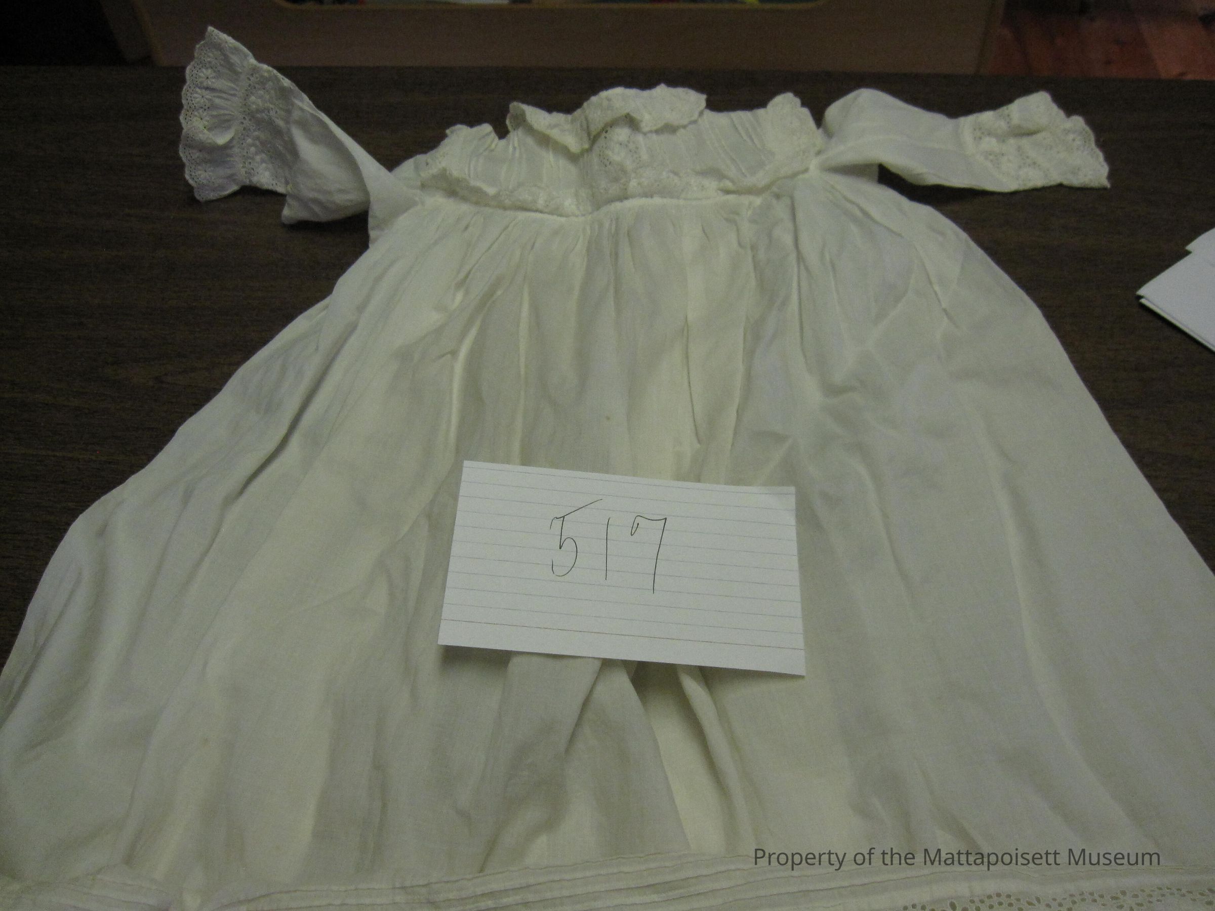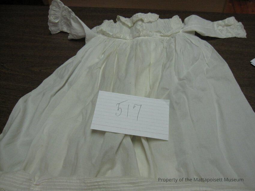 White cotton christening dress. Eyelet detail on sleeves, around collar and along bottom hem. Pintucks around neck.Collection