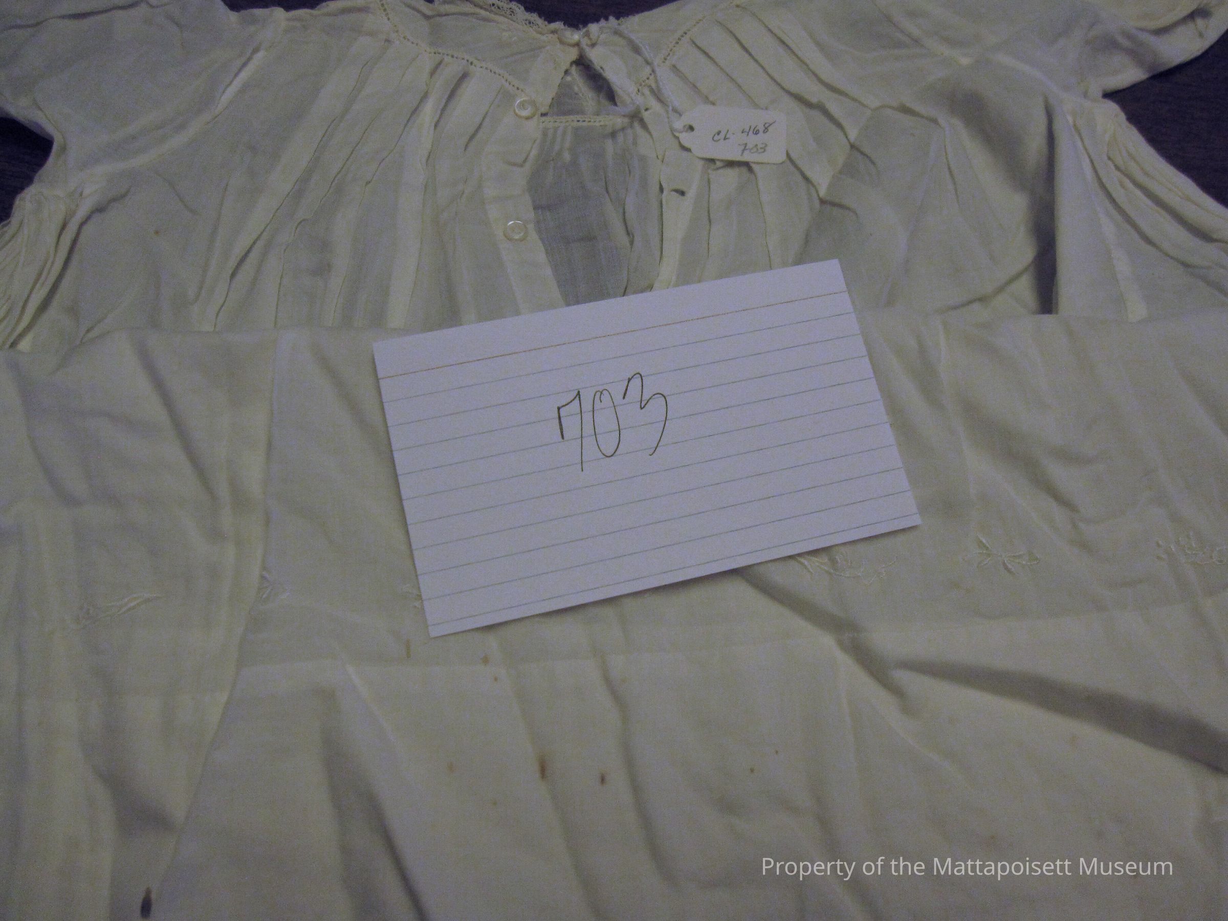 Child's cotton nightdress. Pintucks, lace and embroidery details on sleeves and hem. Gathered under sleeves.Collection