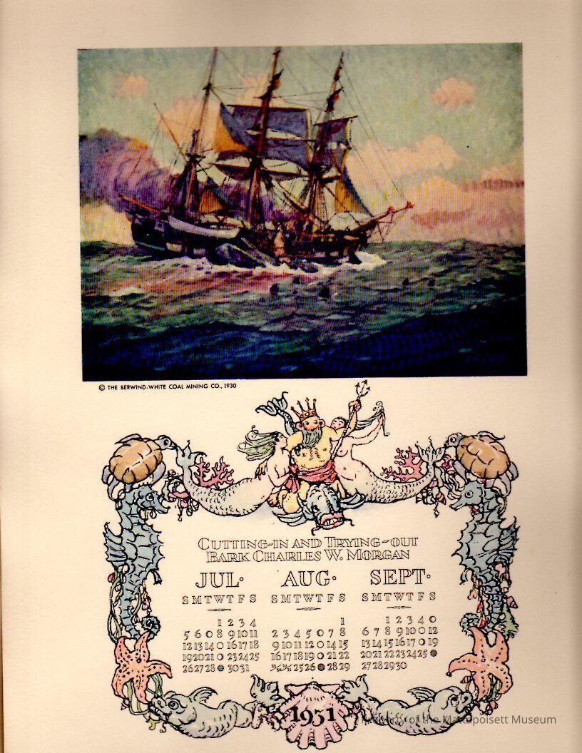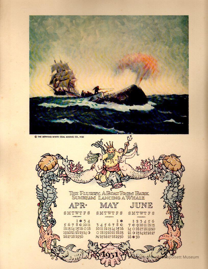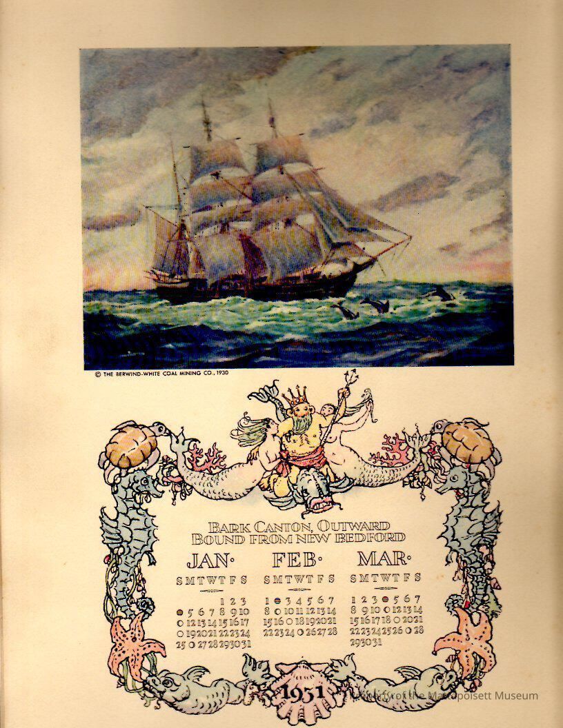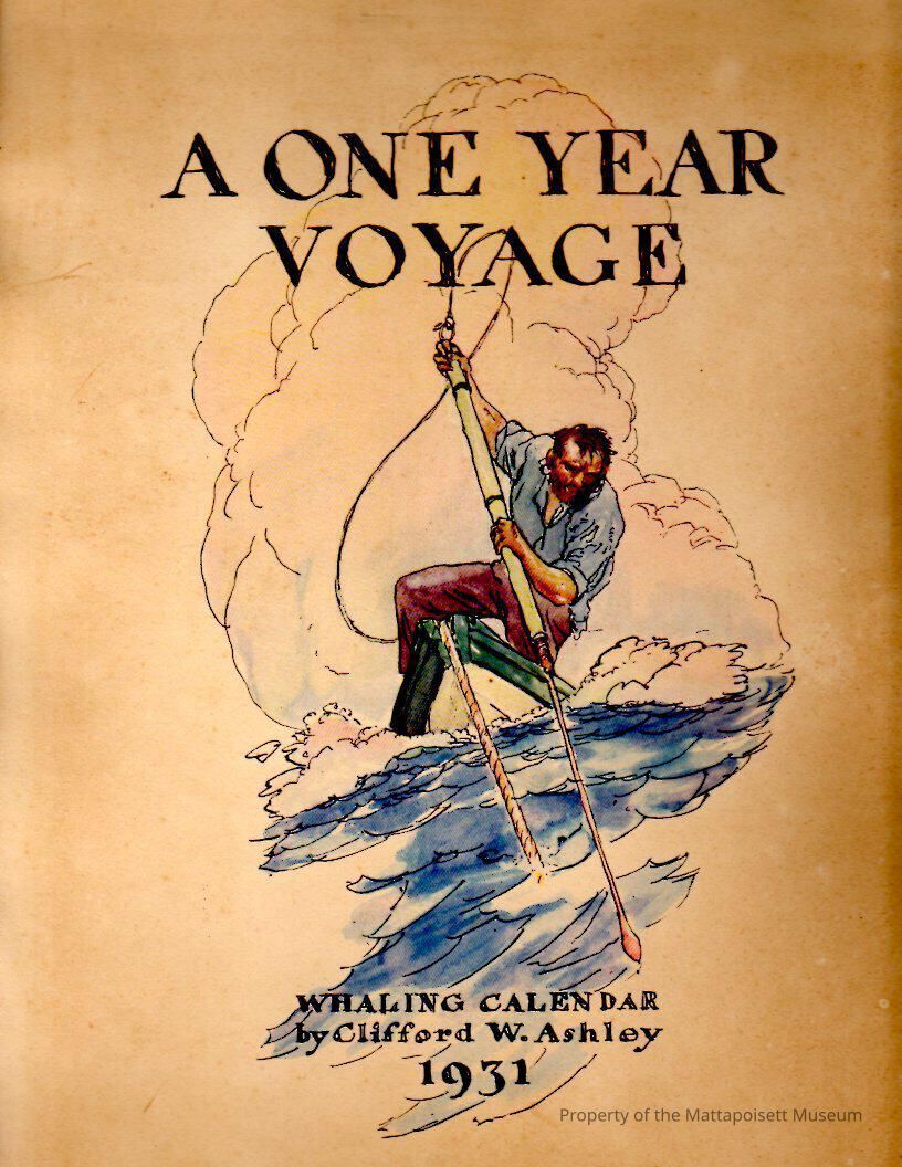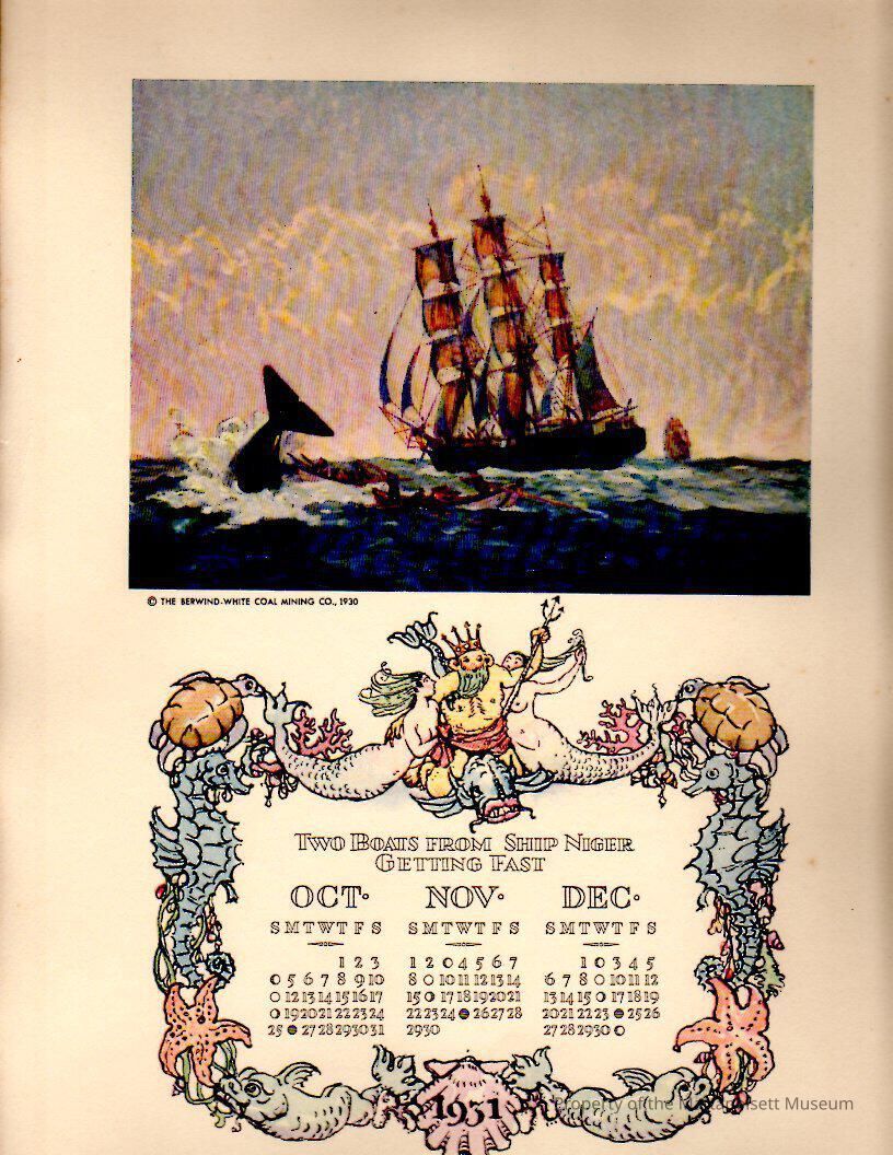 One Year Voyage - Whaling calendar by Clifford W. Ashley for 1931. Three months on each page, four pages total. Tied at the top with multi-colored ribbon. Captions: Page (1) Bark Canton, outward bound from New Bedford, Page (2) The Flurry, a boat from Bark Sunbeam lancing a whale, Page (3) Cutting-in and trying-out Bark Charles W. Morgan, Page (4) Two boats from Ship Niger getting fast.Acquisition