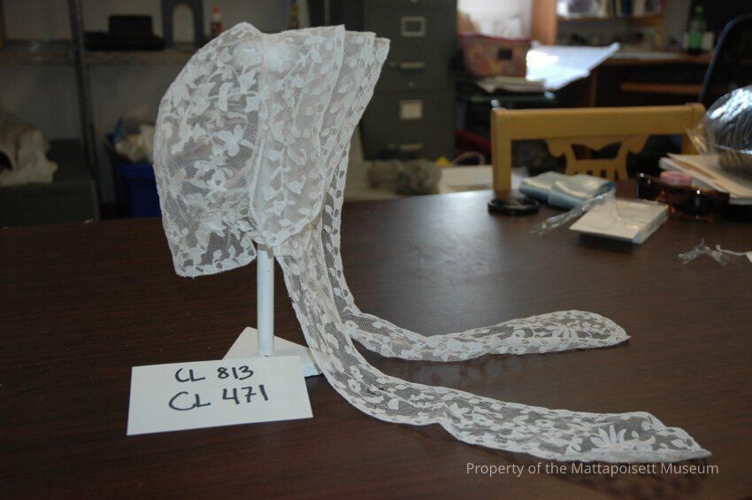 Sheer net bonnet embroidered with leaf pattern and ties.Collection