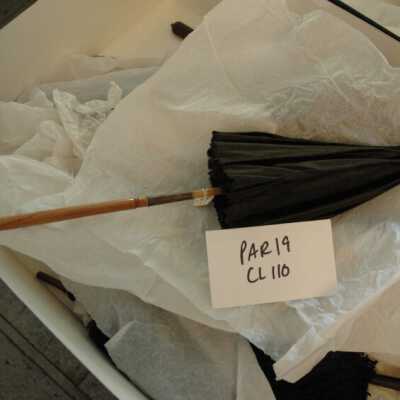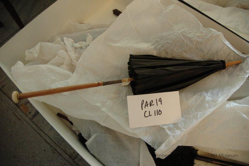 Short, black satin parasol with scalloped edge. Wooden handle with ivory knob.Collection