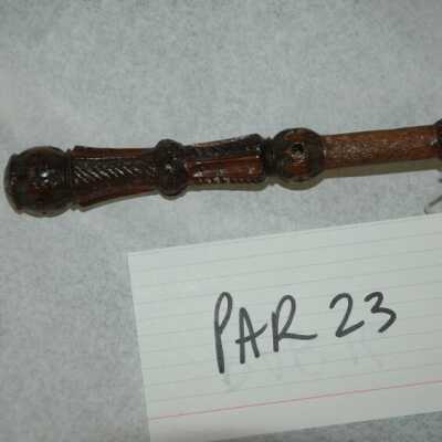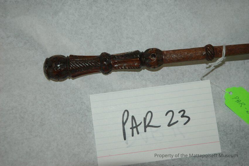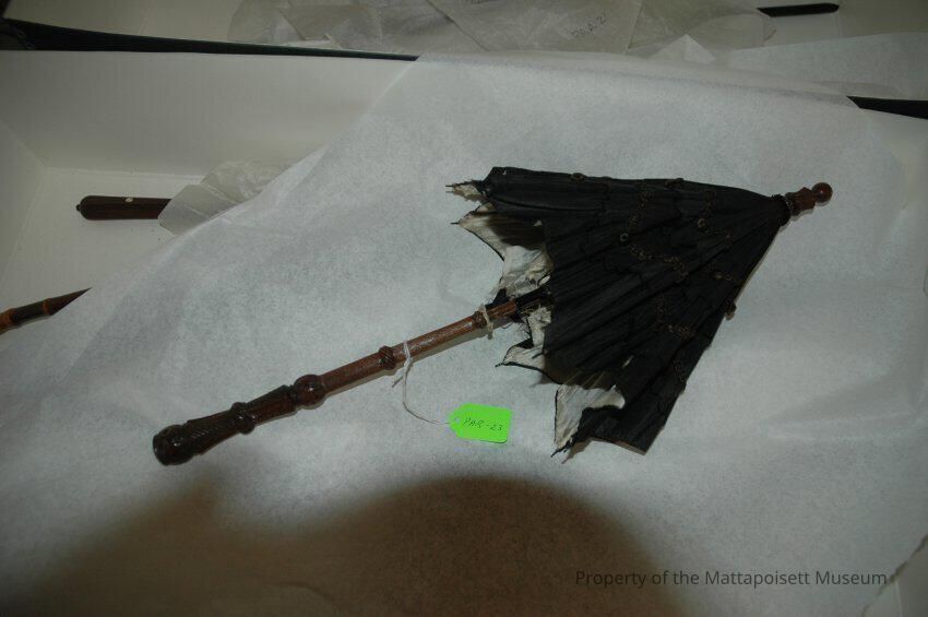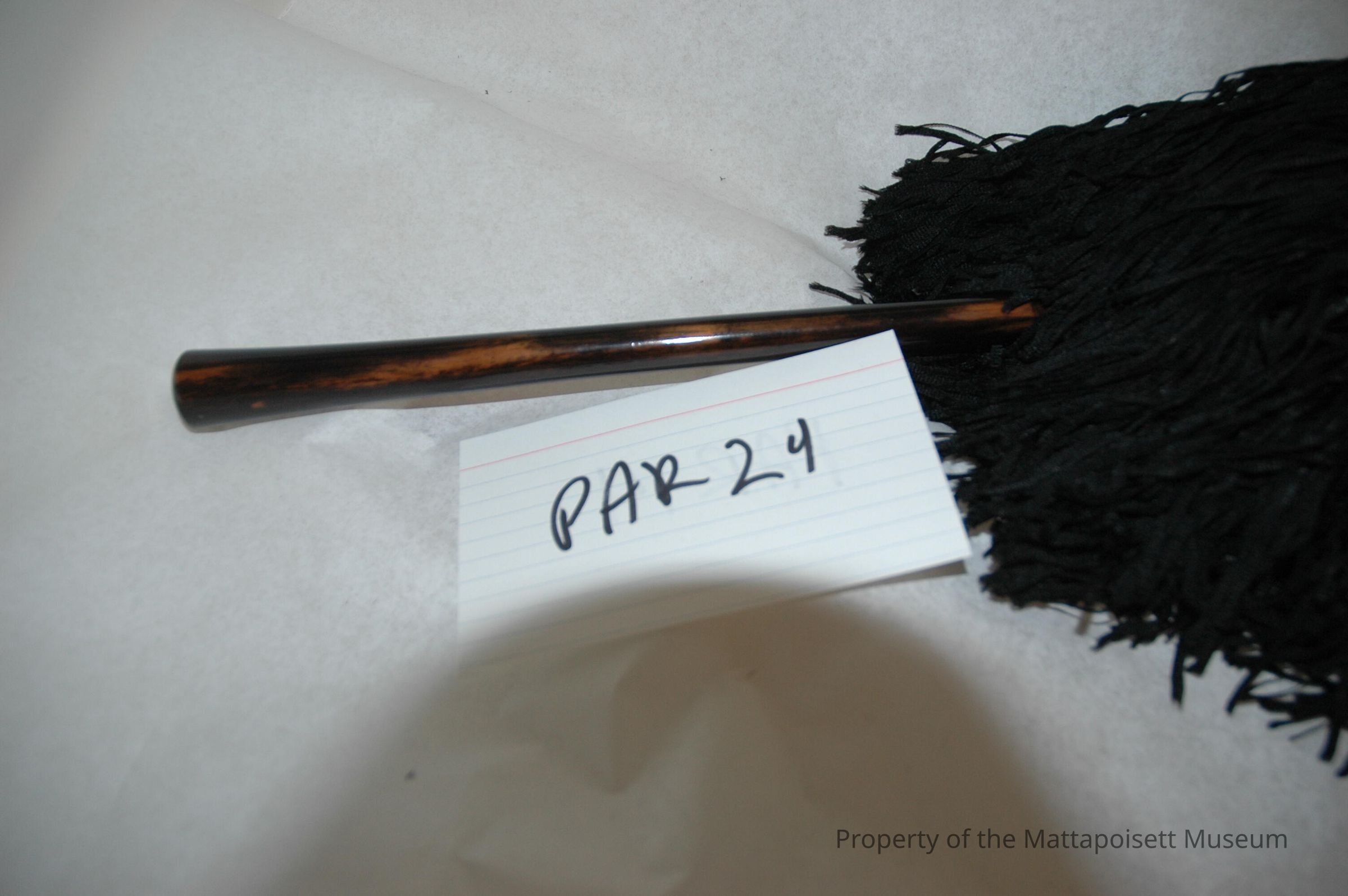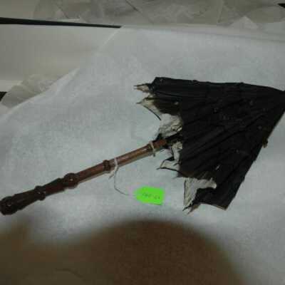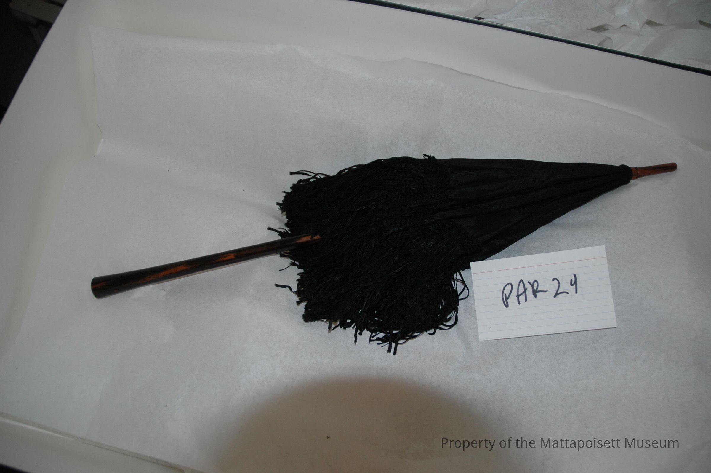Black outer with white silk lining. Scalloped trim, two bands of silk. Varnished wooden handle.Collection