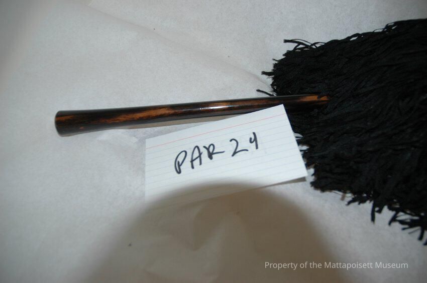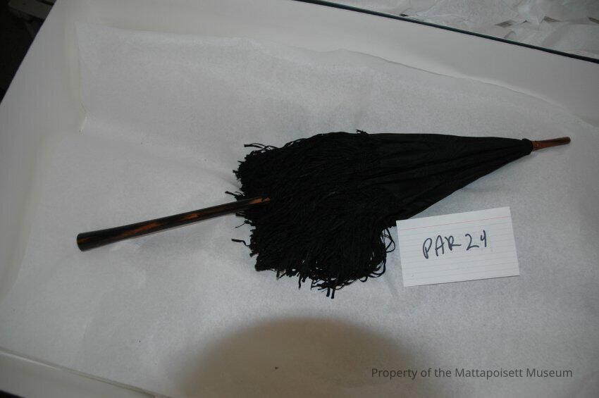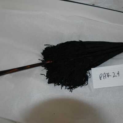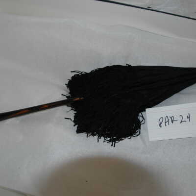 Black silk with fringe, silk lining. Varnished wooden handle.Collection