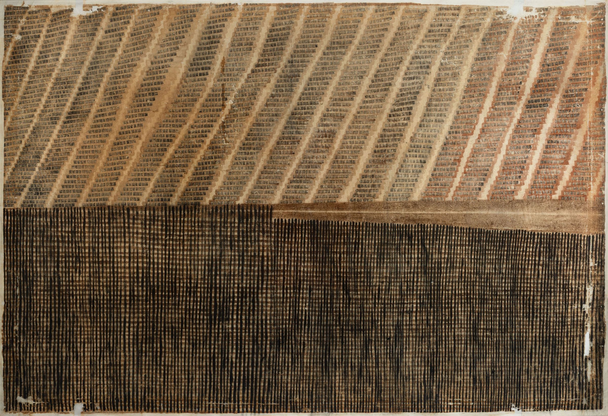 Employing natural vegetable and earth dyes, she stamped the cloth with a distinctive split, asymmetric crosshatch motif in reddish-brown and black pigments, crafting a stunning and historically accurate Hawaiian kapa design - a homage to this centuries-old Hawaiian art form.
