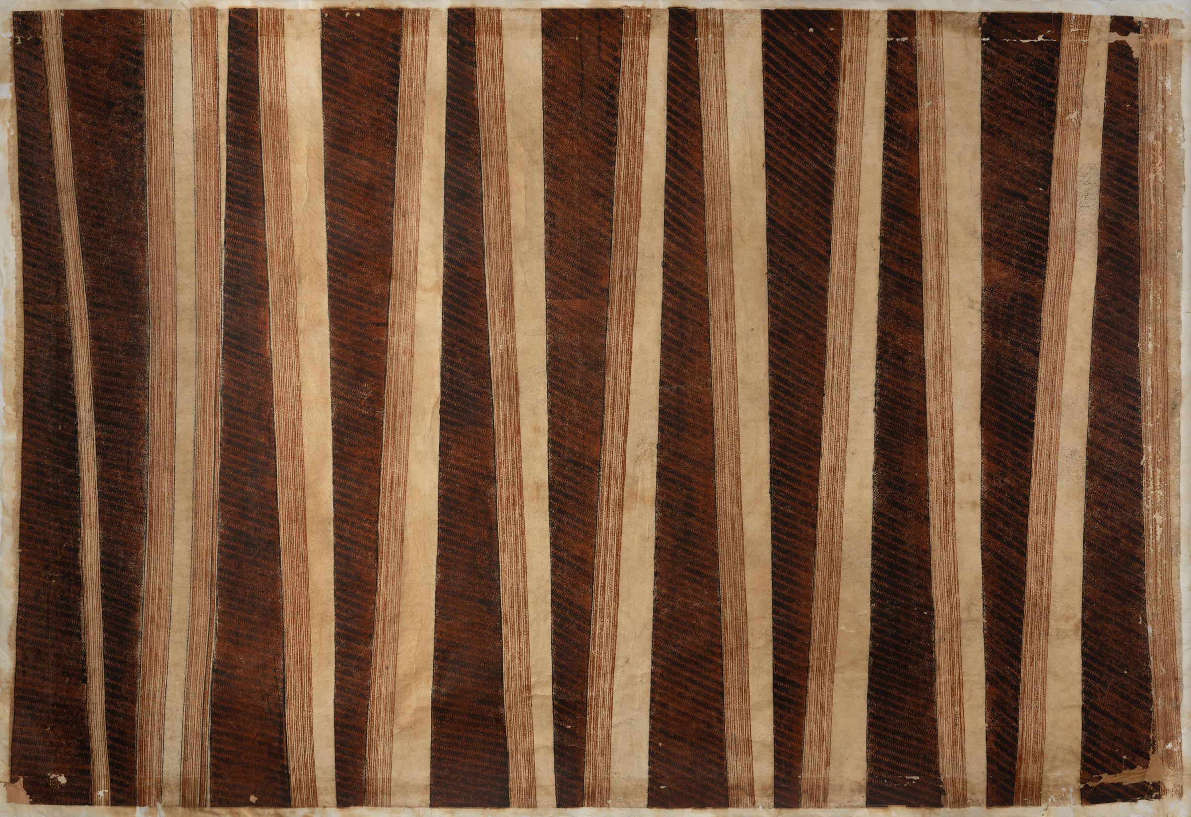 Employing natural vegetable and earth dyes, she stamped the cloth with tapered bands in reddish-brown and black pigments, crafting a stunning and historically accurate Hawaiian kapa design - a homage to this centuries-old Hawaiian art form.