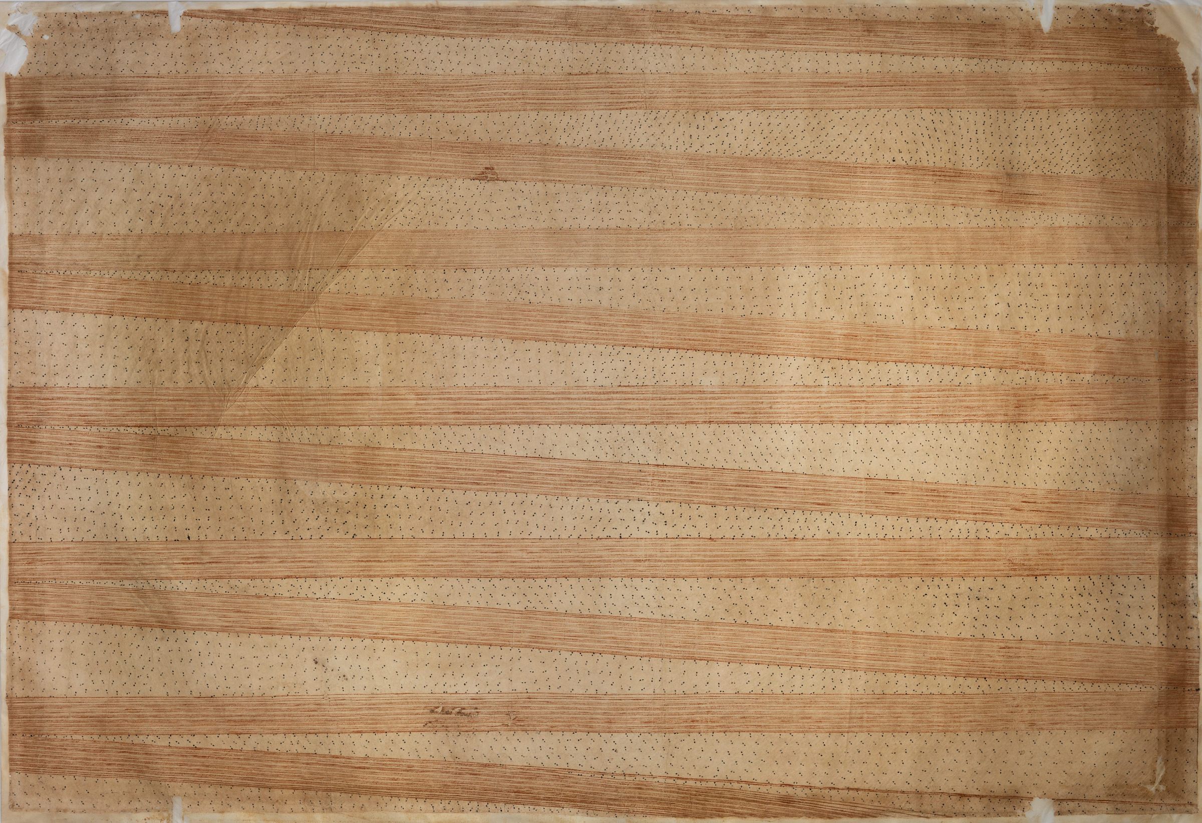 Employing natural reddish-brown and black vegetable and earth dyes, she stamped the cloth with slanted fine lines interspersed with pairs of black dots, crafting a stunning and historically accurate Hawaiian kapa design - a homage to this centuries-old Hawaiian art form.