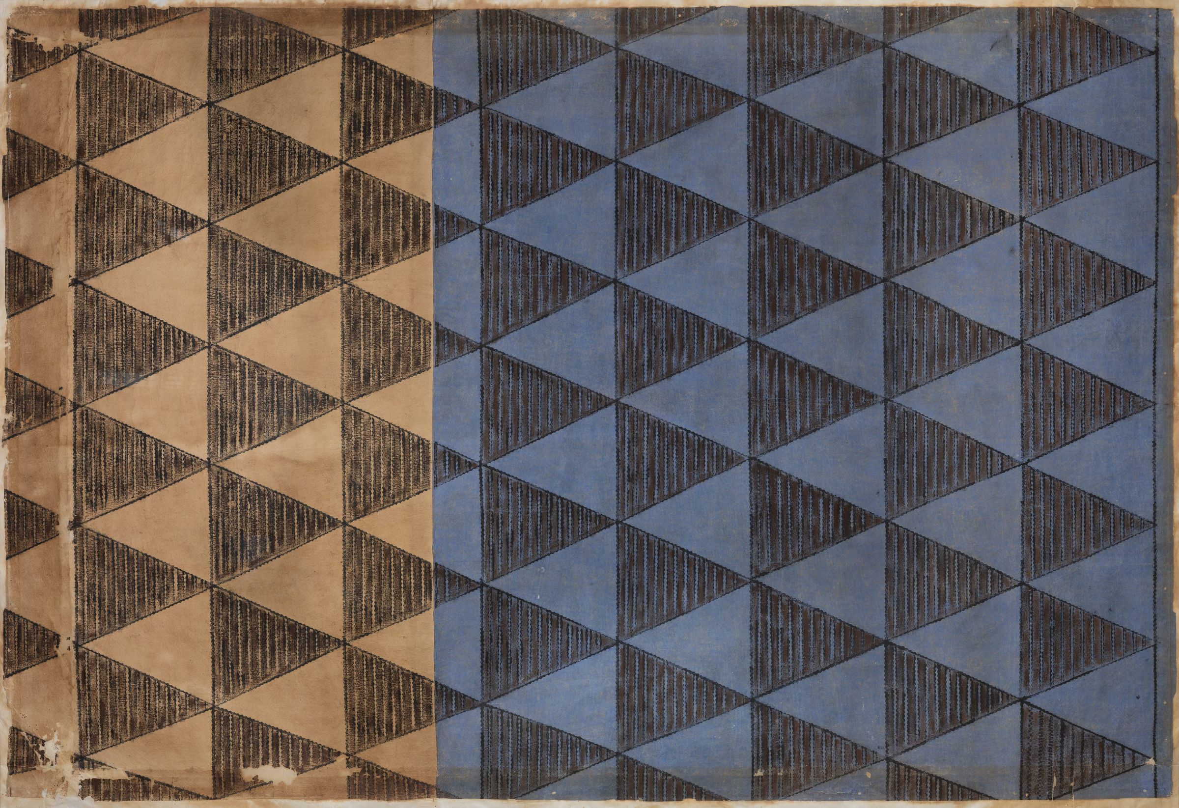 Employing vegetable and earth dyes, she stamped the cloth with a pattern of black triangles filled with wavy stripes in reddish brown and black, two thirds of the upper ground colored blue, a third of the lower ground left plain, crafting a stunning and historically accurate Hawaiian kapa design - a homage to this centuries-old Hawaiian art form.
