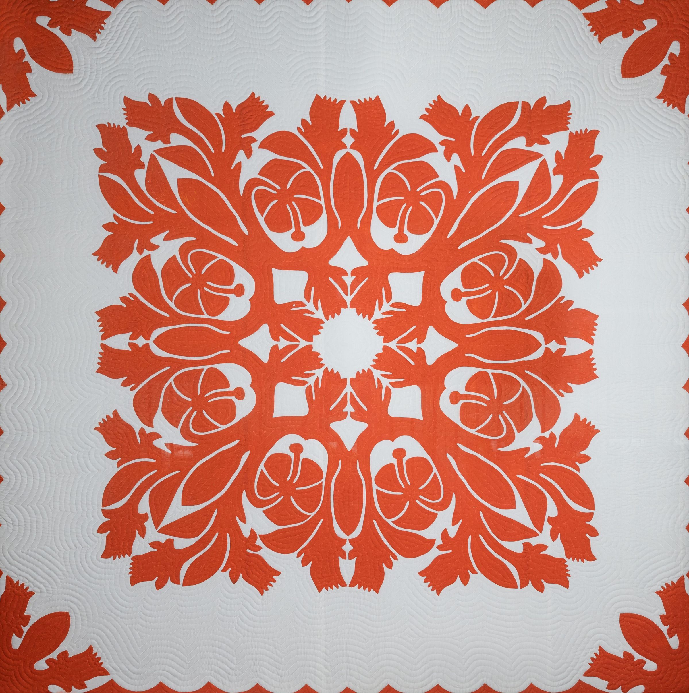 Using a bright orange applique in a single contour stitch, Kalama and her team fashioned this exquisite Hibiscus design, a recognizable emblem of Hawai'i.