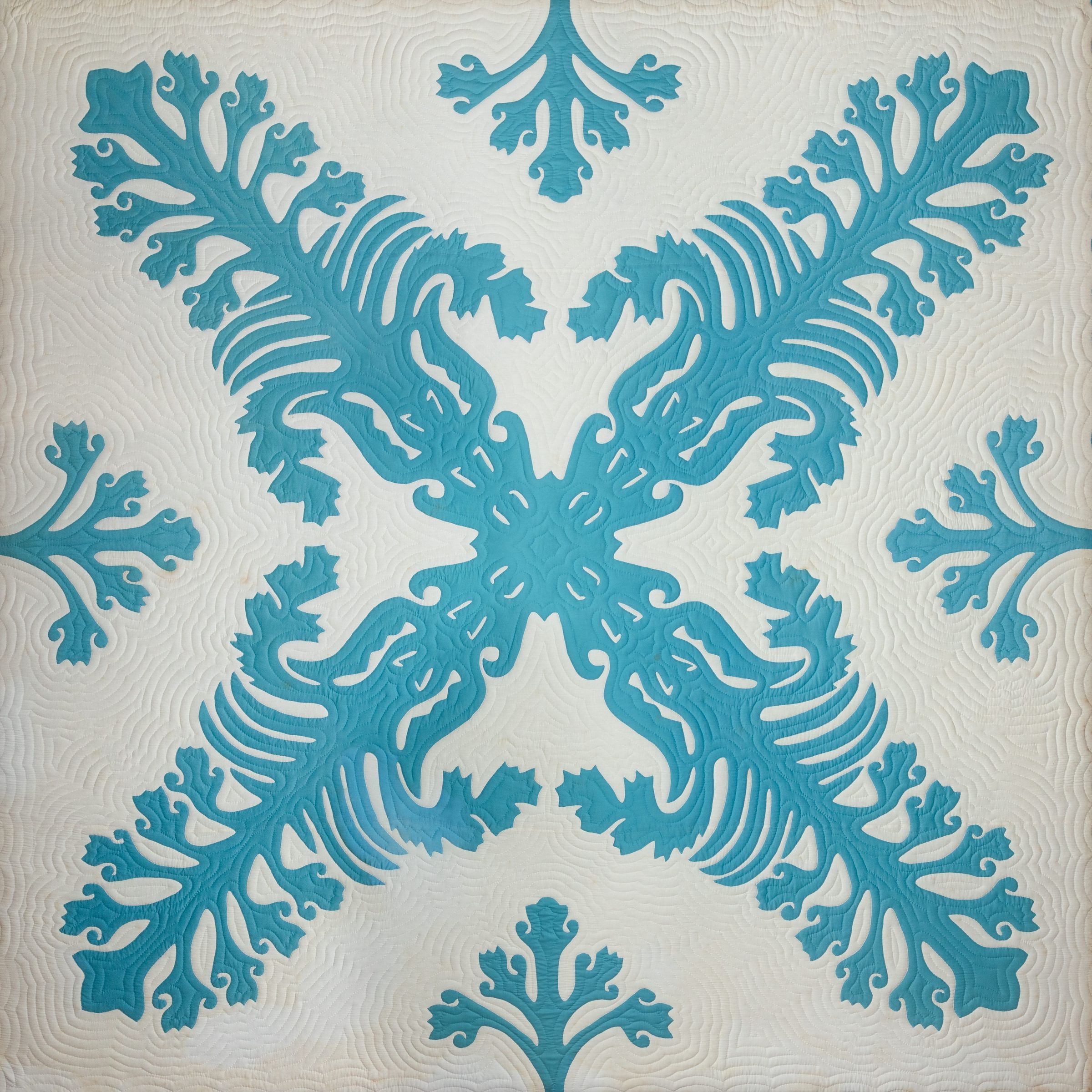 Using a blue applique in a single contour stitch, Kalama and her team fashioned this exquisite Silversword design, a recognizable member of Hawai’i’s rich island flora.