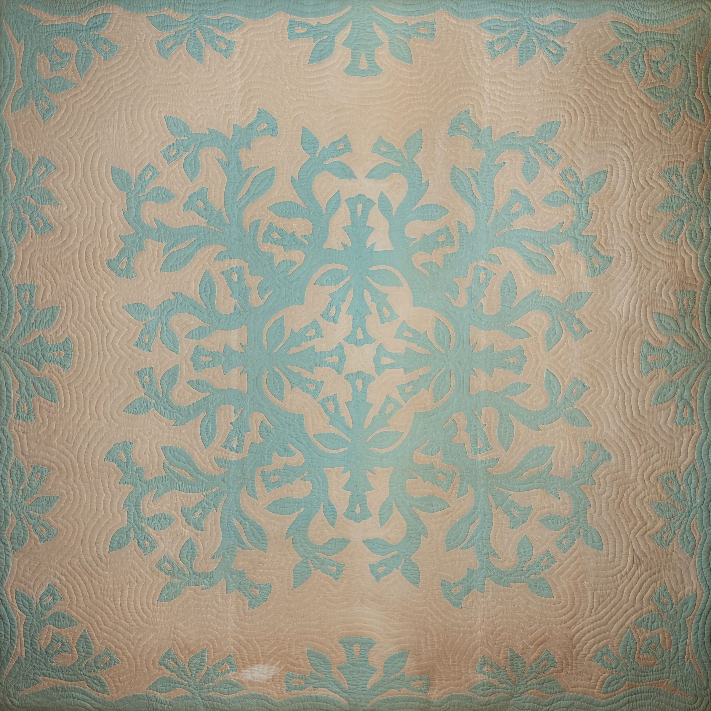 Using a pastel blue applique in a single contour stitch, Kalama and her team fashioned this exquisite floral and leaf design, a reverent nod to the flower gardens of Queen Liliukalani, Hawai’i’s last reigning monarch.