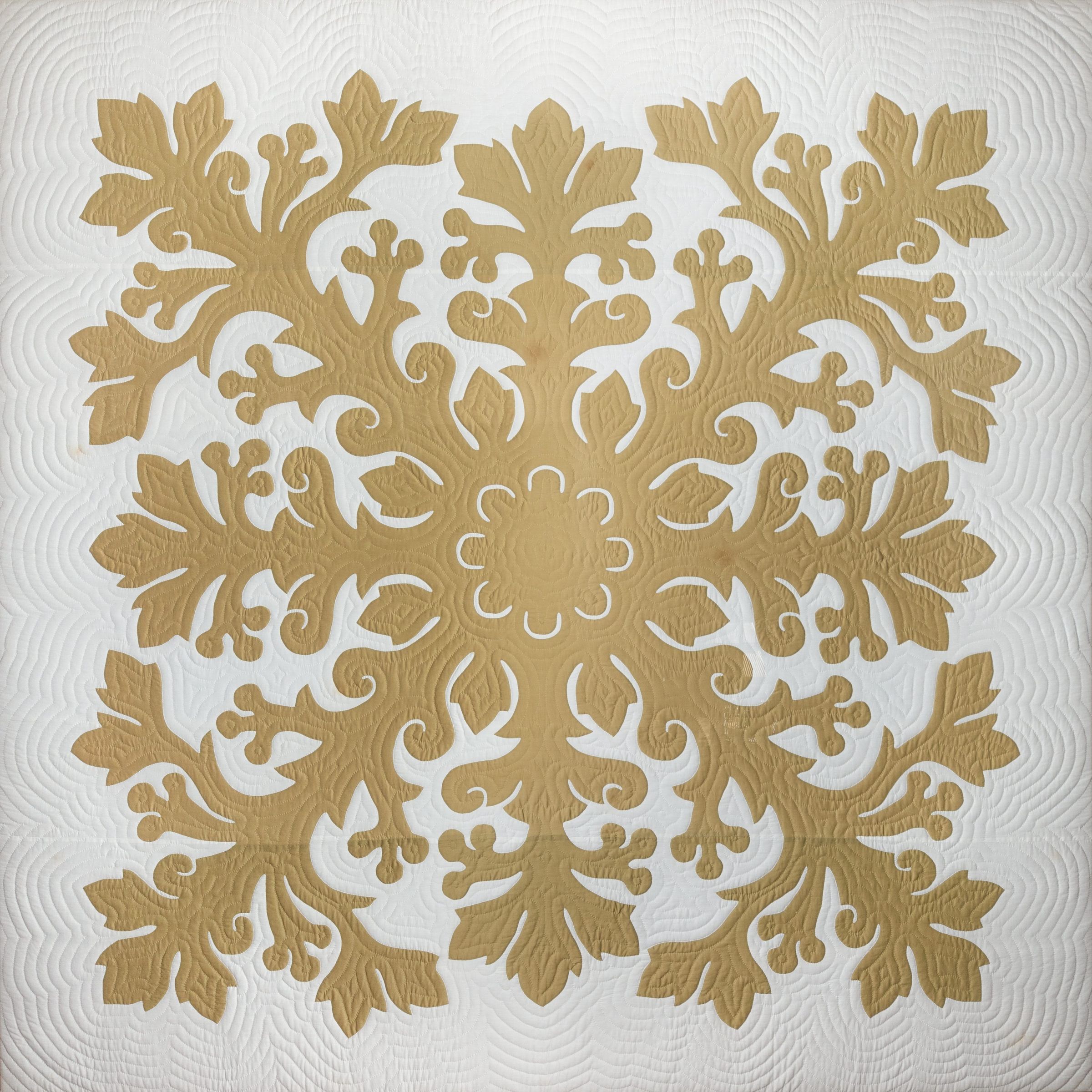 Using a pale olive applique in a single contour stitch, Kalama and her team fashioned this exquisite leaf design, meant to represent the legendary kukui nut (candlenut) grove of Lanikaula. Thought to have lived several centuries ago, Lanikaula was a famed kahuna (expert or wise person), who had a great knowledge of life and death, and some believe he possessed the power of divination. However, following his death, his sons hid his burial site in a grove of kukui nut trees to hide his body from persecutors, and the site has since become a place of pilgrimage and worship.