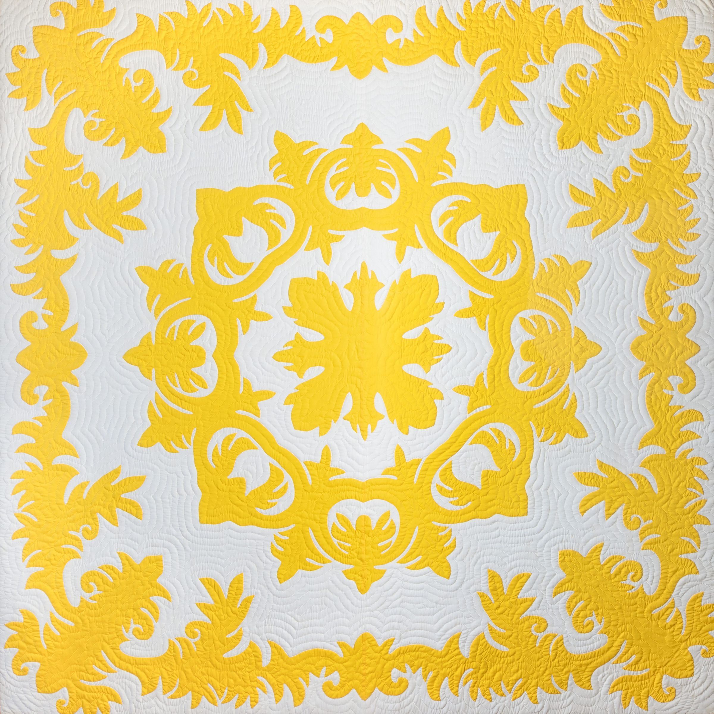 Using a bright yellow applique in a single contour stitch, Kalama and her team fashioned this exquisite scrolled leaf design, a homage to Hawai’i’s rich and diverse flora.