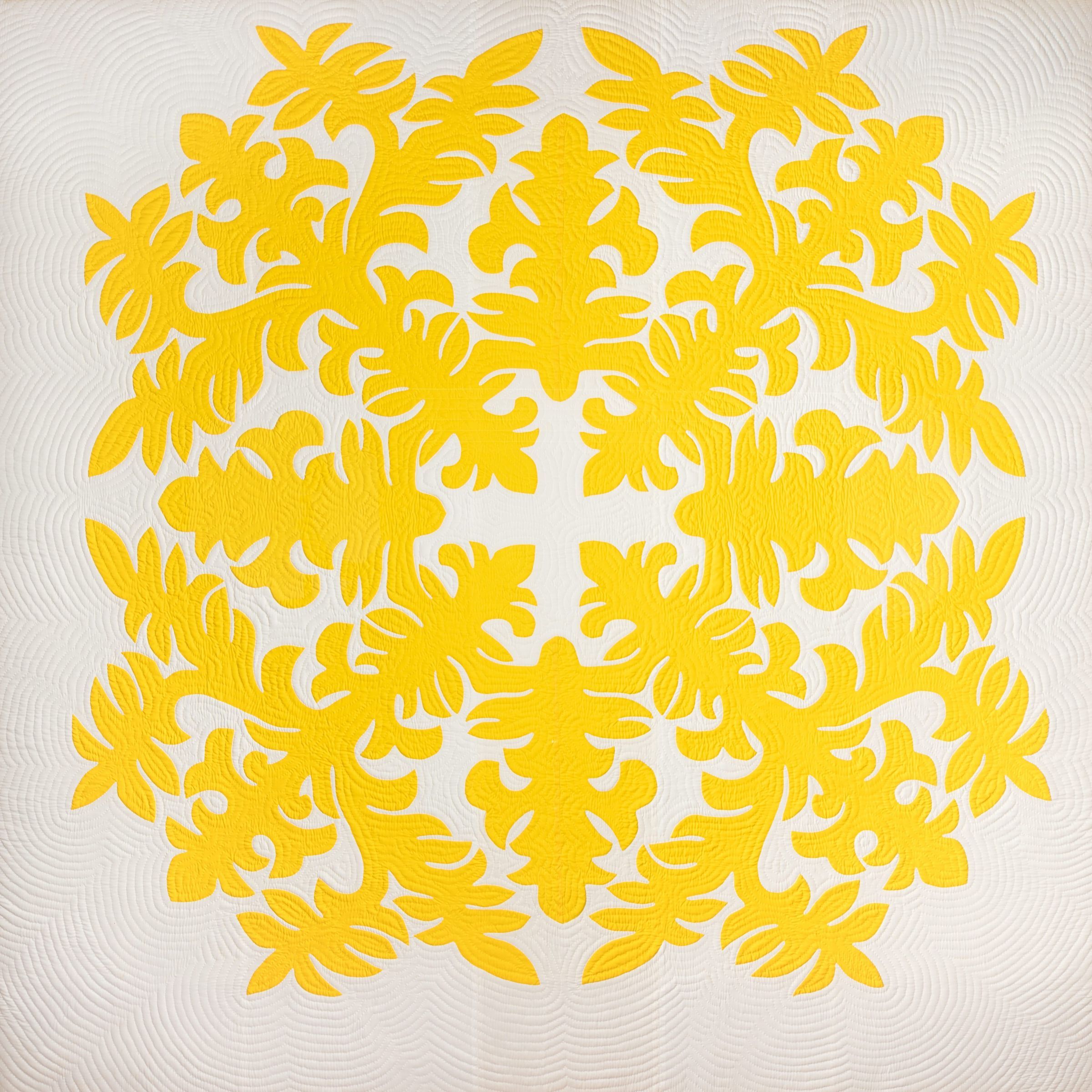 Using a yellow applique in a single contour stitch, Kalama and her team fashioned this exquisite leaf design, meant to represent the Lanai-o-Kolomona, or Solomon’s porch.