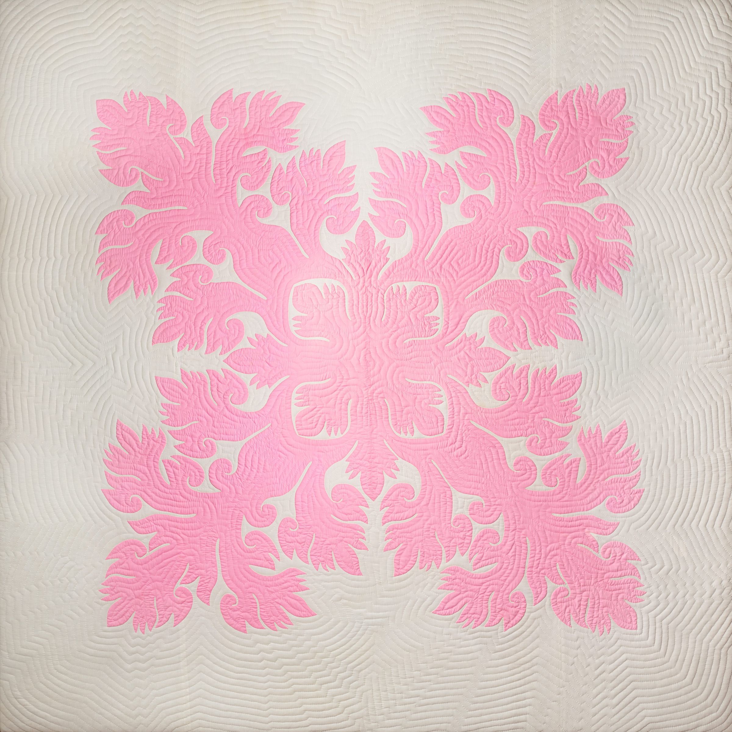 Using a pink applique in a single contour stitch, Kalama and her team fashioned this exquisite leafy design, meant to emulate the Hawaiian concept of Puamohala, or unfolding.