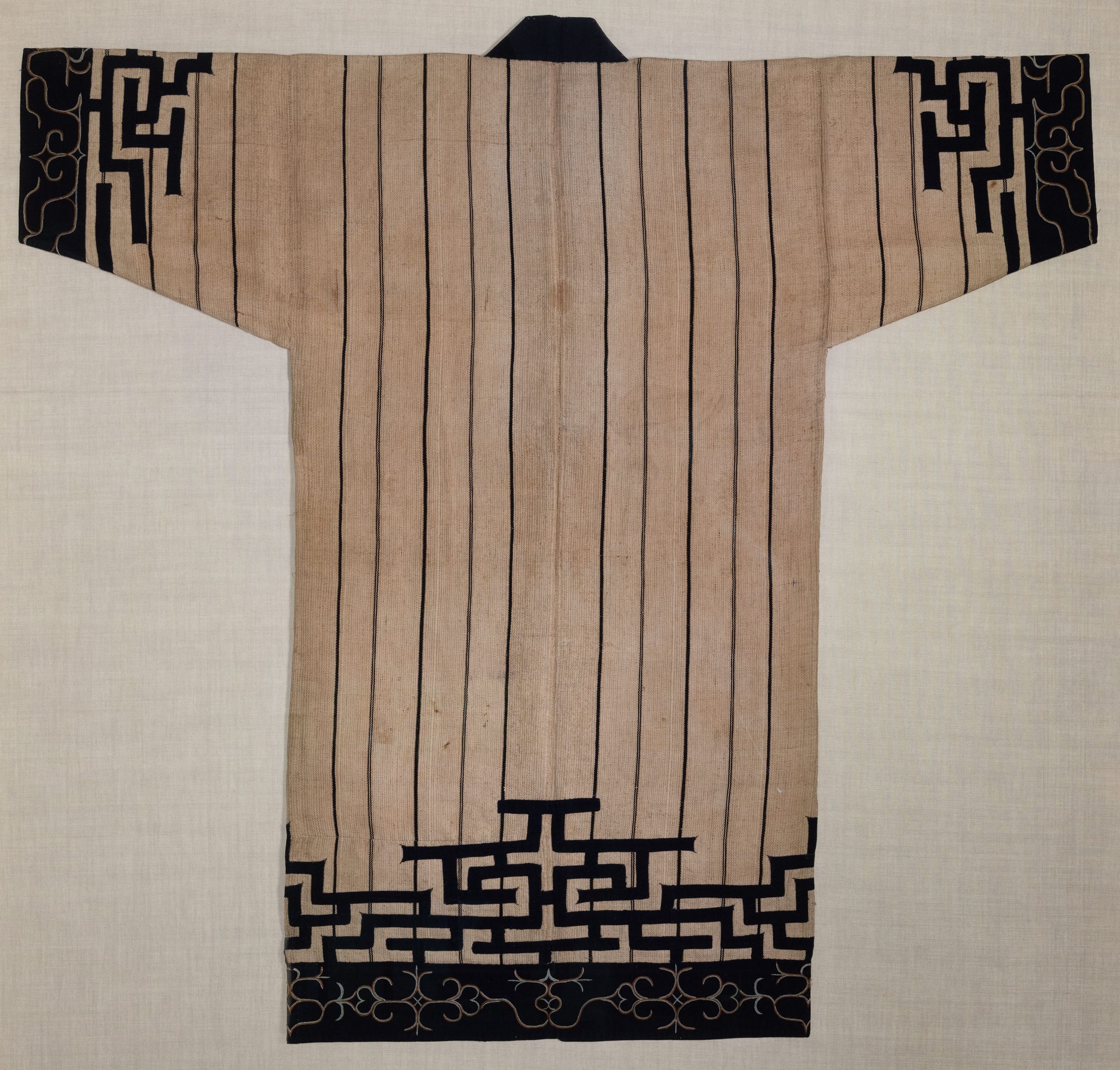 Ainu women used attush, a fabric made from soaking the soft inner strips of elm bark until it separates into fibres and can be woven, to make these distinctive robes that were meant to keep wearers warm, while also warding off evil spirits. The neck, sleves and low hem are adorned with navy blue cotton applique on the sleeve ends and low hem, and decorated with embroidered scrollwork. The imported Japanese cotton used to finish these peices is reflective of Japan's colonial annexation of Hokakaido and its increasing influence on the historically culturally distinct Ainu people from the late 19th century.