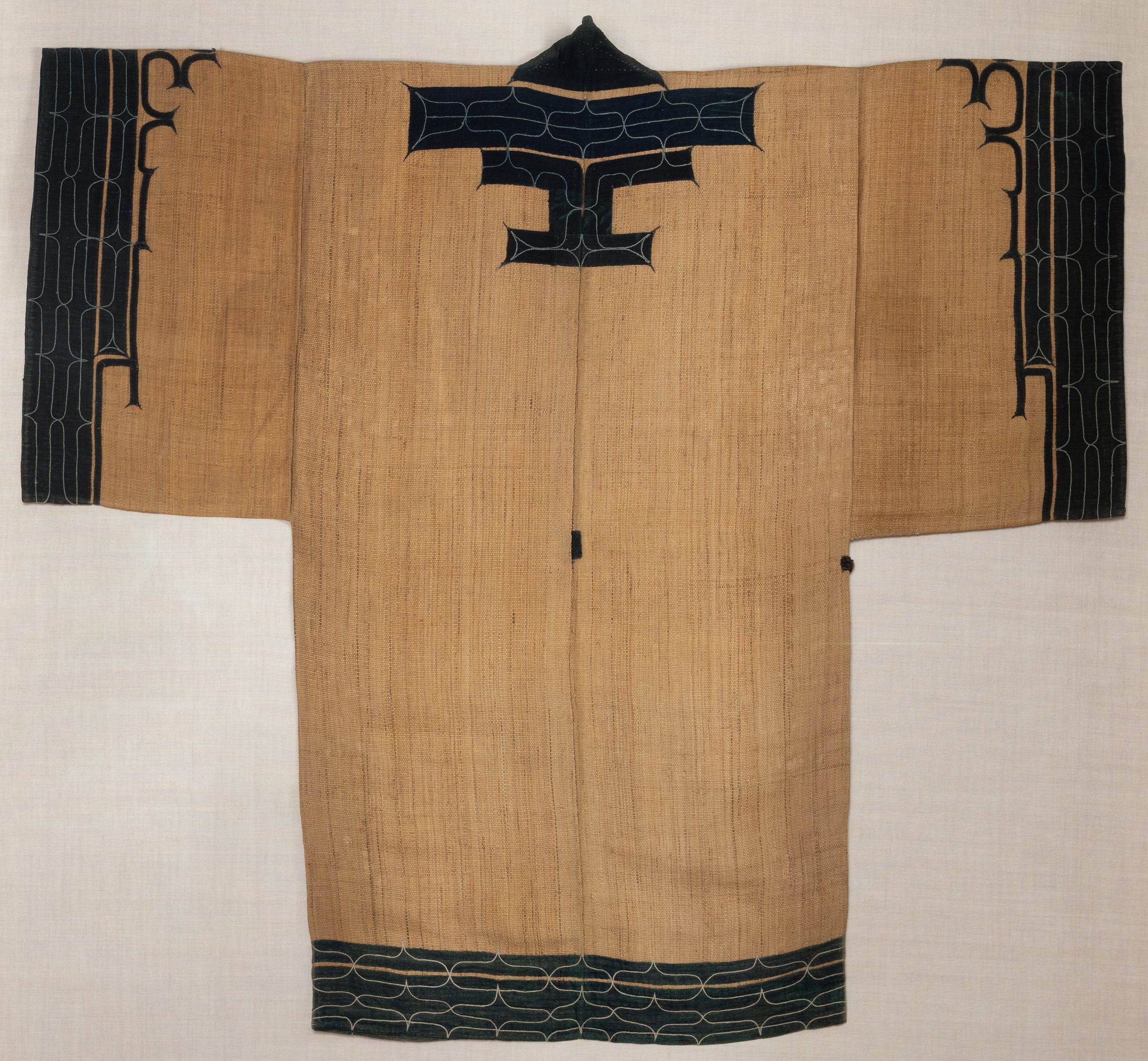 Ainu women used attush, a fabric made from soaking the soft inner strips of elm bark until it separates into fibres and can be woven, to make these distinctive robes that were meant to keep wearers warm, while also warding off evil spirits. The neck, sleves and low hem are adorned with navy blue cotton applique and intricate embroidery. The imported Japanese cotton used to finish these peices is reflective of Japan's colonial annexation of Hokakaido and its increasing influence on the historically culturally distinct Ainu people from the late 19th century.